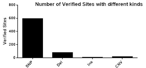 表1. 泛腫瘤相關(guān)靶向基因部分展示 3. 染色體全覆蓋,除了Y染色體外,其他染色體都有涉及; 圖1. 在不同染色體編號(hào)上的位點(diǎn)數(shù)(經(jīng)過(guò)驗(yàn)證的位點(diǎn)) 4. 變異種類多:涉及SNP,deletion,insertion,CNV等等; 圖2. 不同種類突變形式的位點(diǎn)數(shù)(經(jīng)過(guò)驗(yàn)證的位點(diǎn)) 5. 突變頻率全覆蓋,從1%-100%,各區(qū)間都有涉及; 圖3. 不同突變頻率的位點(diǎn)數(shù)(經(jīng)過(guò)驗(yàn)證的位點(diǎn)) 6. 突變類型全覆蓋,有UTR區(qū)域,有內(nèi)含子,有外顯子,有錯(cuò)義突變,有同義突變,有供體變異等等; 圖4. 突變細(xì)分種類的位點(diǎn)數(shù)(經(jīng)過(guò)驗(yàn)證的位點(diǎn)) 7. 位點(diǎn)多,超過(guò)680個(gè)位點(diǎn),全部有對(duì)應(yīng)的Cosmic ID或/和dbSNP ID注釋; 圖5. 經(jīng)過(guò)dbSNP ID和Cosmic ID注釋的位點(diǎn)數(shù)(經(jīng)過(guò)驗(yàn)證的位點(diǎn)) 8. 多平臺(tái)驗(yàn)證,數(shù)據(jù)準(zhǔn)確可信賴; 8.1 其中1000x panel驗(yàn)證16個(gè)位點(diǎn),panel為知名商業(yè)化公司產(chǎn)品; 表2. 16個(gè)經(jīng)過(guò)1000x NGS-Panel試劑盒驗(yàn)證的位點(diǎn)信息 8.2 DdPCR驗(yàn)證8個(gè)位點(diǎn),Bio-Rad QX200和Bio-Rad原裝試劑 表3. 8個(gè)經(jīng)過(guò)DdPCR(bio-rad)試劑盒驗(yàn)證的位點(diǎn)信息 8.3 500X WES驗(yàn)證所有位點(diǎn),IDT xGenExome Research Panel v1.0捕獲,HiSeq X-TEN測(cè)序 表4. 500X WES驗(yàn)證的400個(gè)基因信息 9. 基因覆蓋科學(xué),超過(guò)400個(gè)基因,覆蓋國(guó)內(nèi)外多個(gè)知名panel的設(shè)計(jì); 表5. 基因覆蓋率比較 免費(fèi)試用活動(dòng)開(kāi)始了,感興趣的親們可以聯(lián)系我們4008-750-250 |