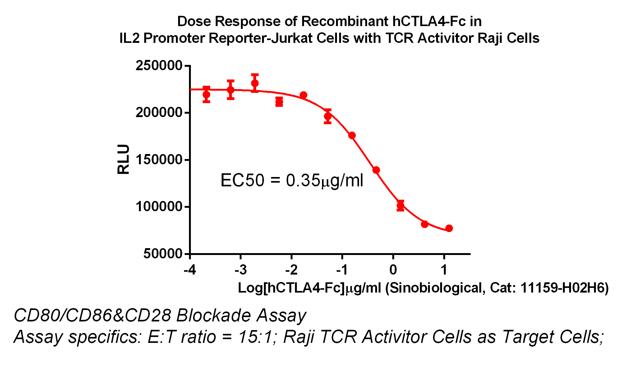 Figure 3. Dose Response of Recombinant hCTLA4-Fc in IL2 Promoter Reporter-Jurkat Cells with TCR Activitor Raji Cells.