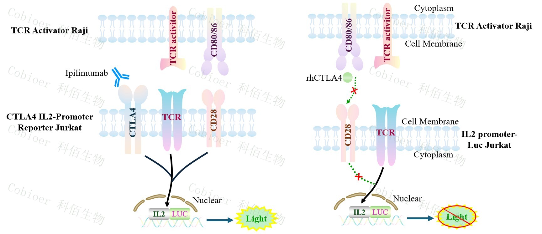 TCR Activator Raji 報告基因藥靶模型很好的模擬了體內(nèi) CD28&CD80/CD86 或者CTLA4 的信號轉(zhuǎn)導過程,原理見下圖所示。