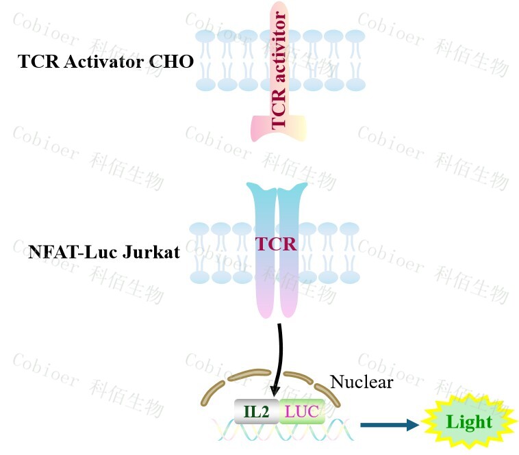 TCR Activator CHO 報(bào)告基因藥靶模型很好的模擬了體內(nèi) TCR 的信號(hào)轉(zhuǎn)導(dǎo)過(guò)程,原理見下圖所示。