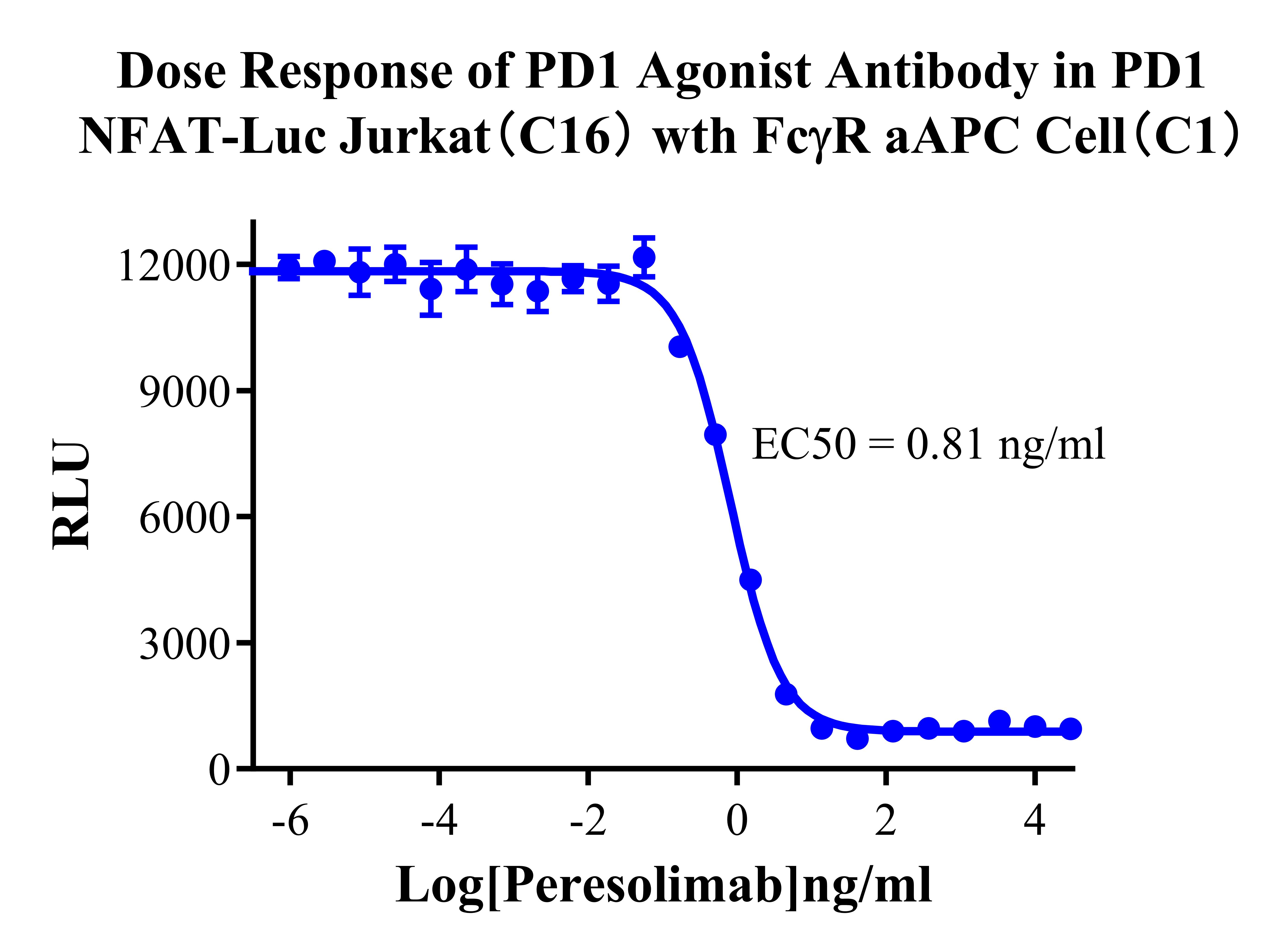 ![]() Figure 6. Detect Luciferase assay by Ultra Luciferase Detection Kit CBPH0001(we strongly suggest to purchase from Cobioer). Dose response of PD1 Agonist Antibody in PD1 NFAT-Luc Jurkat(C16) with FcγR aAPC Cell(C1). |