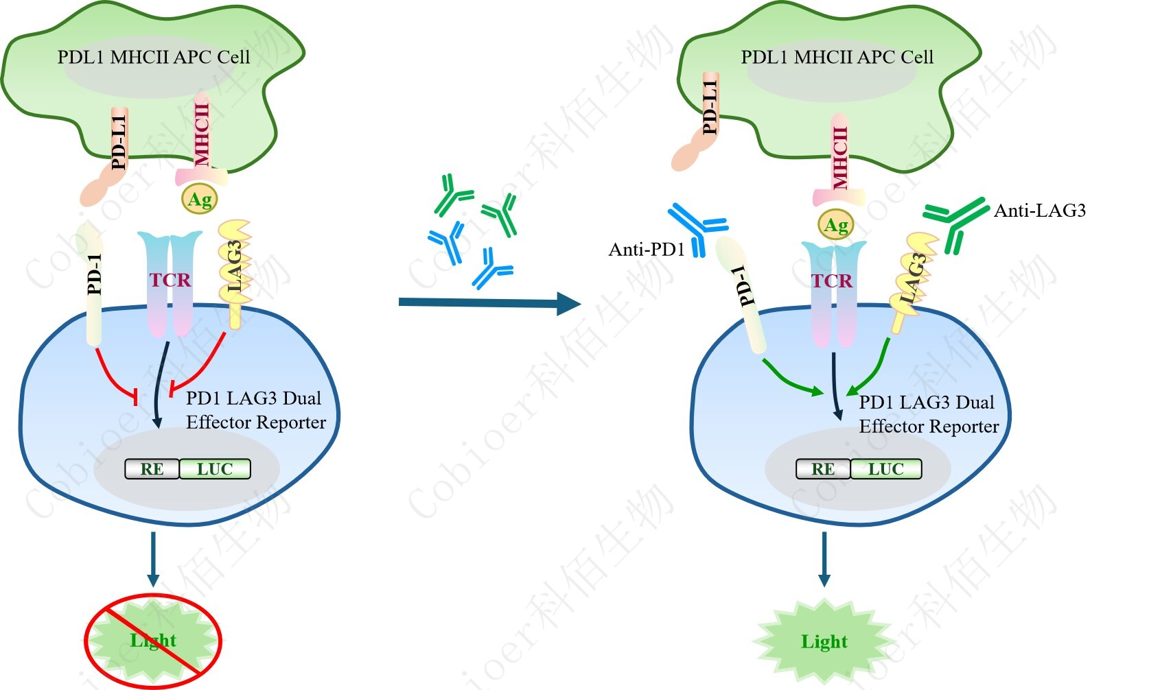PD1 LAG3 Dual Effector Reporter Cell 報(bào)告基因藥靶模型很好的模擬了體內(nèi) PD1&LAG3 的信號(hào)轉(zhuǎn)導(dǎo)過(guò)程,原理見(jiàn)下圖所示。![]() Figure 1. PD1 LAG3 Dual Effector Reporter Cell 細(xì)胞模型原理圖 |