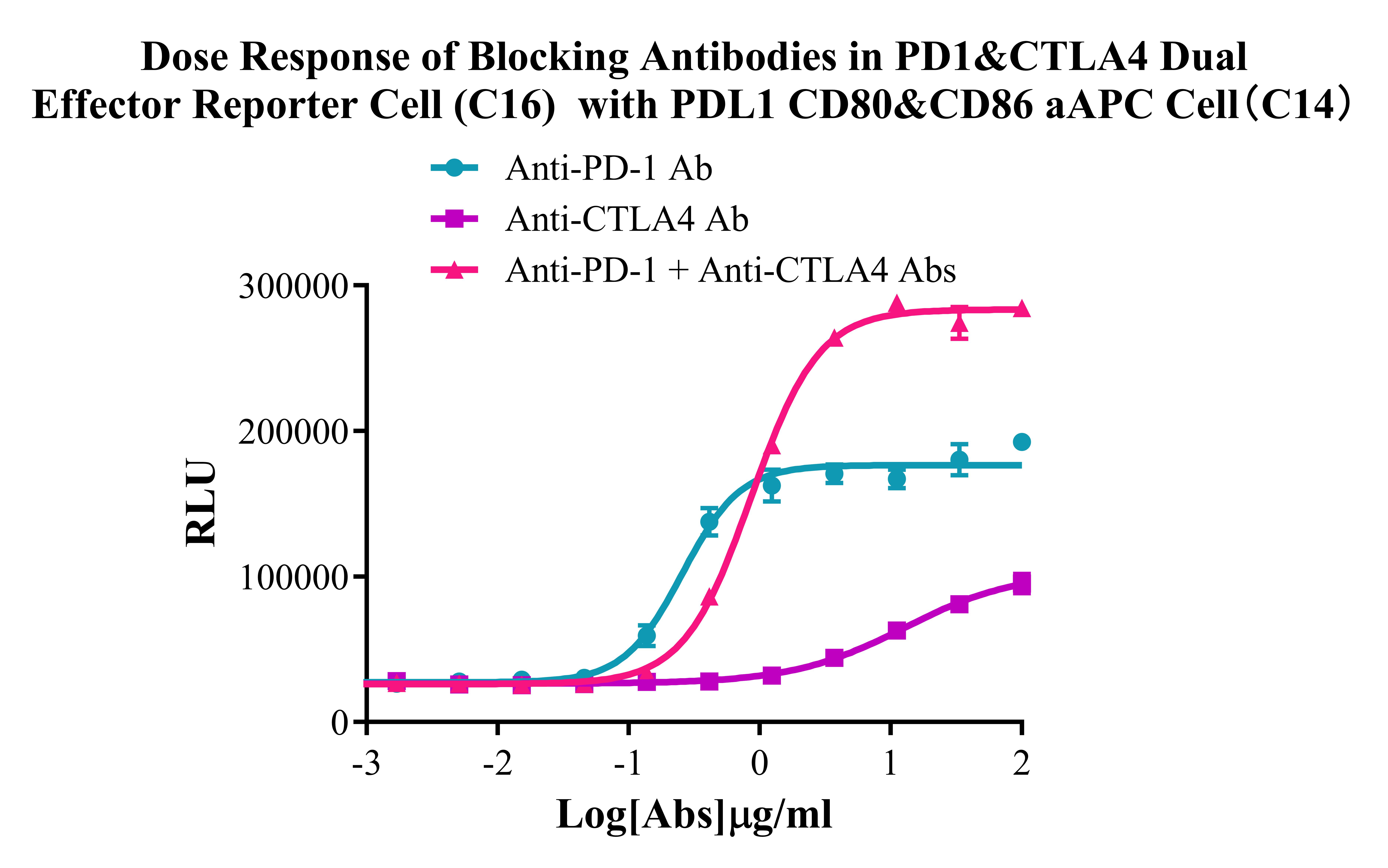 Figure 1. Dose Response of Blocking Antibodies in PD1&CTLA4 Dual Effector Reporter Cell (C16) With PD-L1 CD80&CD86 aAPC Cell (C14).