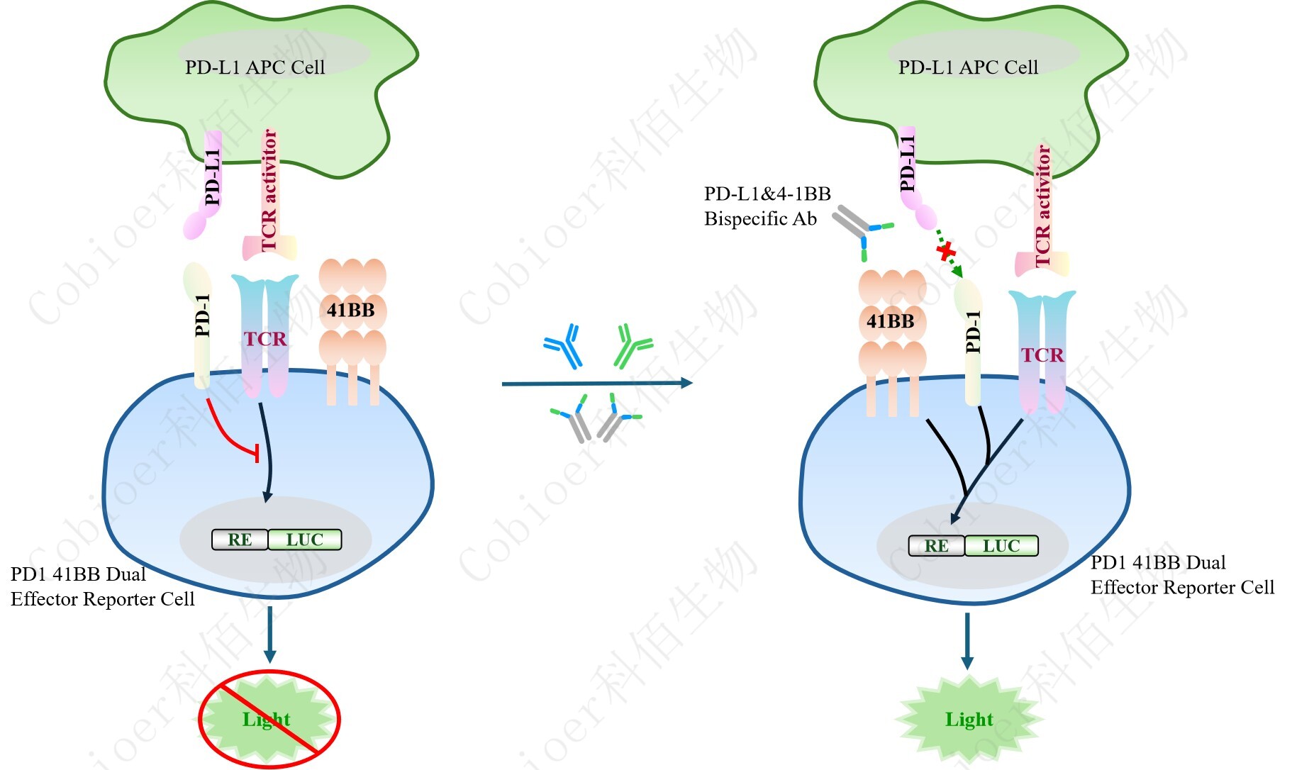 PD1 4-1BB Dual Effector Reporter Cell 報告基因藥靶模型很好的模擬了體內(nèi) PD1&4- 1BB 的信號轉(zhuǎn)導(dǎo)過程,原理見下圖所示。