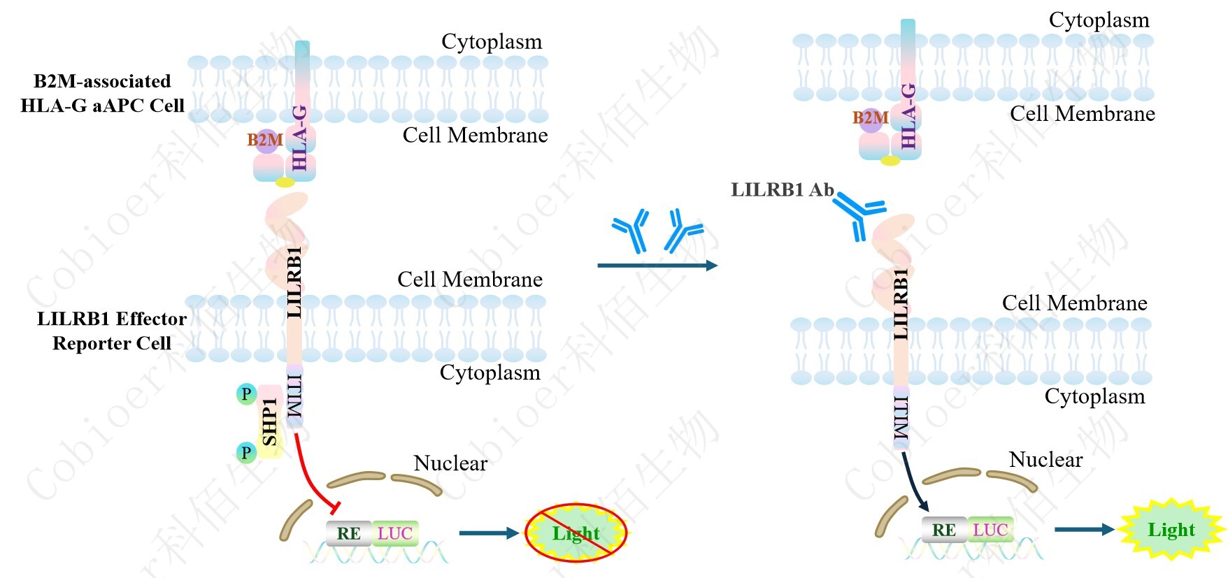LILRB1 Effector Reporter Cell 報(bào)告基因藥靶模型很好的模擬了體內(nèi) LILRB1 的信號(hào)轉(zhuǎn)導(dǎo)過(guò)程,原理見(jiàn)下圖所示。![]() Figure 1. LILRB1 Effector Reporter Cell 模型原理圖 |