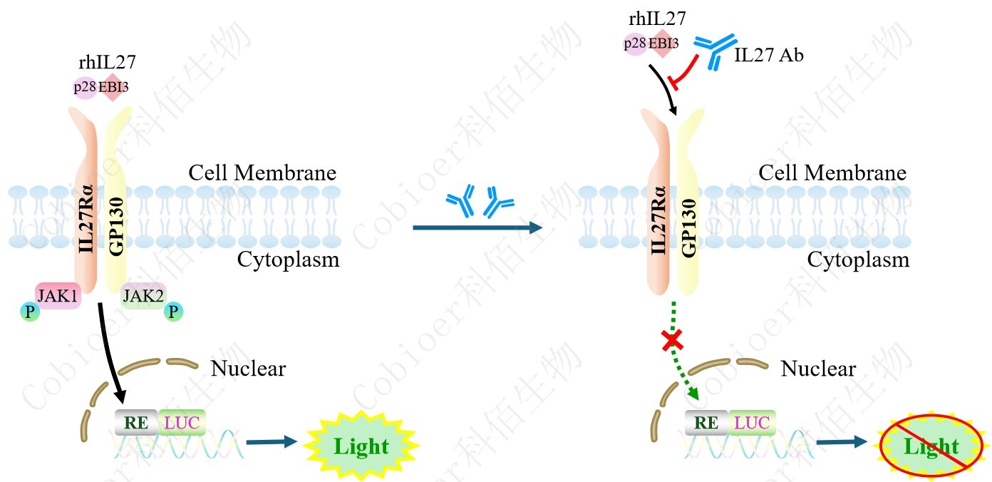 IL27 Effector Reporter Cell 報告基因藥靶模型很好的模擬了體內(nèi) IL27 的信號轉(zhuǎn)導過程, 原理見下圖所示。![]() Figure 1. IL27 Effector Reporter Cell 細胞模型原理圖 |