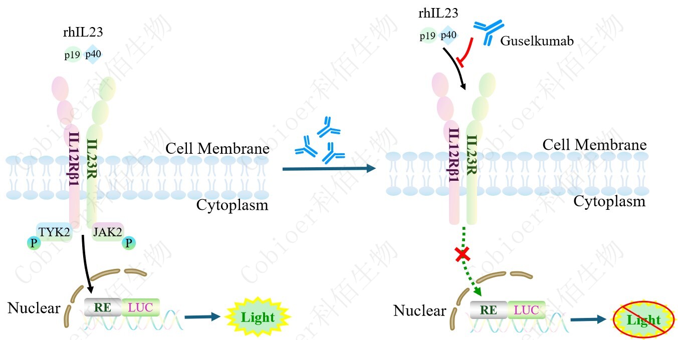 IL23 Effector Reporter Cell 報告基因藥靶模型很好的模擬了體內(nèi) IL23 的信號轉導過程, 原理見下圖所示。 ![]() Figure 1. IL23 Effector Reporter Cell 細胞模型原理圖