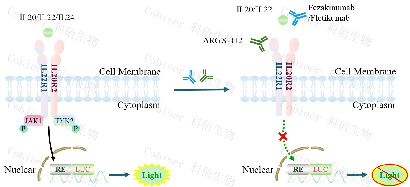 hIL20/IL22/IL24 Triple Effector Reporter Cell 報(bào)告基因藥靶模型很好的模擬了體內(nèi)IL20/IL22/IL24 的信號(hào)轉(zhuǎn)導(dǎo)過(guò)程,原理見(jiàn)下圖所示。