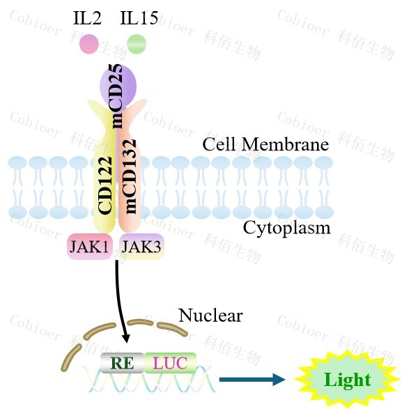 hIL2/IL15(mCD25 hCD122 mCD132) Effector Reporter Cell 報告基因藥靶模型很好的模擬了體內 IL2 受體三亞基的信號轉導過程,原理見下圖所示。 Figure 1. hIL2/IL15(mCD25 hCD122 mCD132)Effector Reporter Cell 細胞模型原理圖 |