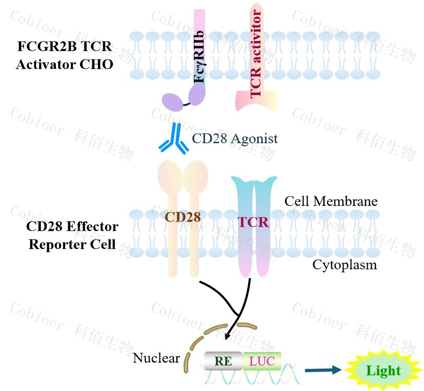 FCGR2B TCR Activator CHO,在基礎(chǔ)細(xì)胞上穩(wěn)定表達(dá) FcγRIIb 和 aAPC。 FCGR2B TCR Activator CHO 作為 CD28 Effector Reporter Cell 的靶細(xì)胞進(jìn)行功能檢測,其原理圖見下圖所示。![]() Figure 1. FCGR2B TCR Activator CHO 的原理圖 |