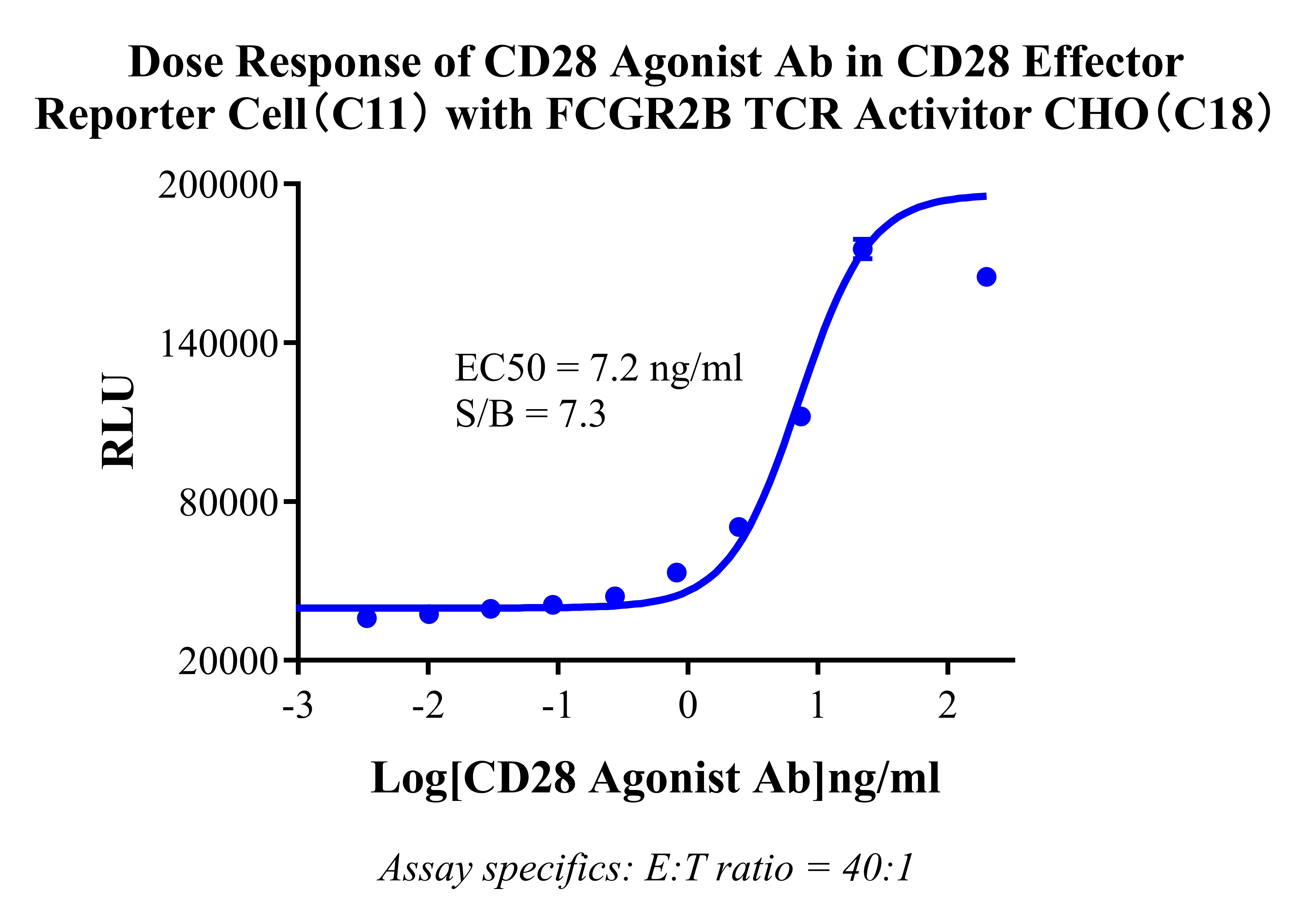 Figure 3 Dose Response of CD28 Agonist Ab in CD28 Effector Reporter Cells(C11) With FCGR2B TCR Activitor CHO Cells, the EC50 was 7.2ng/ml. |