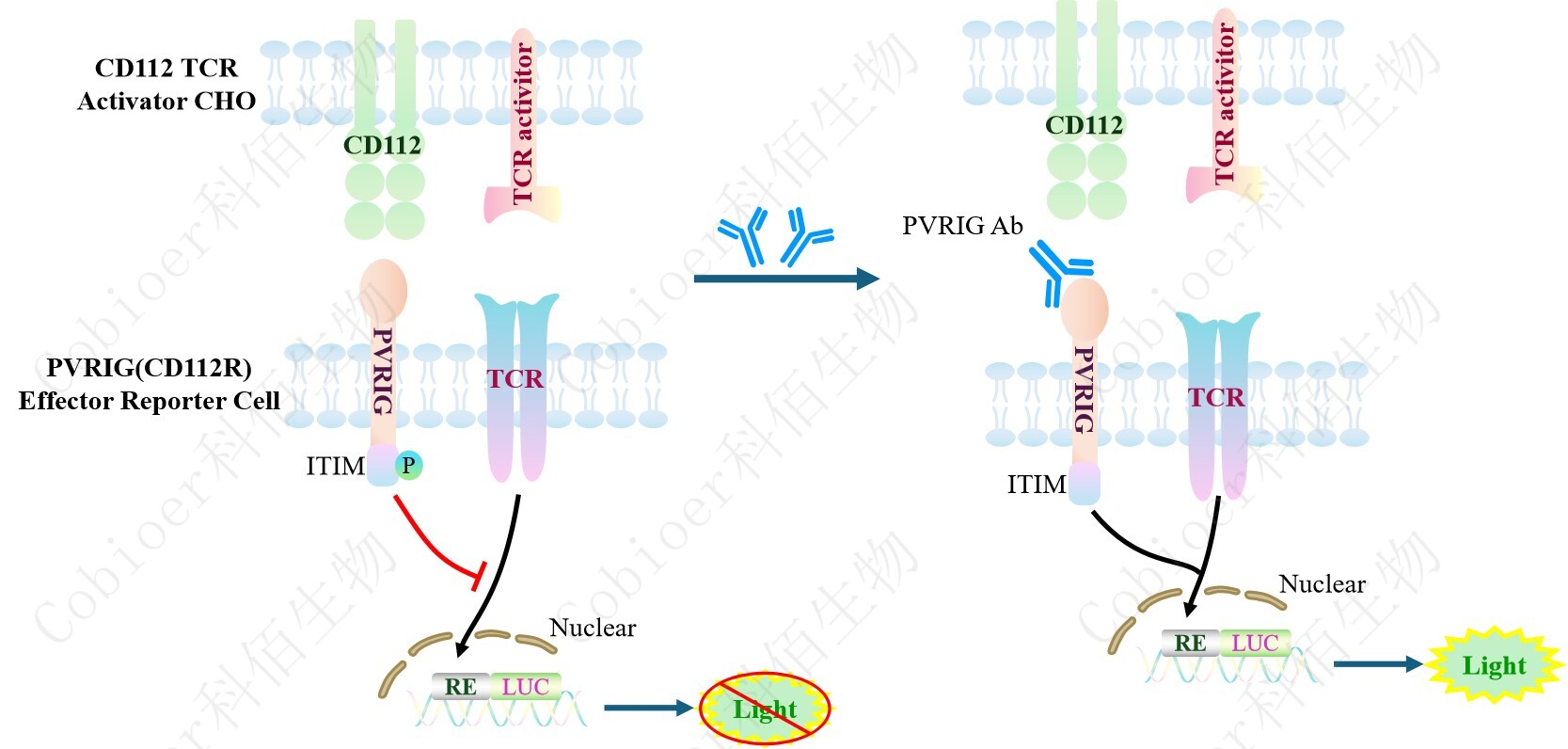 PVRIG(CD112R) Effector Reporter Cell 報(bào)告基因藥靶模型很好的模擬了體內(nèi) PVRIG 的 信號(hào)轉(zhuǎn)導(dǎo)過程,原理見下圖所示。