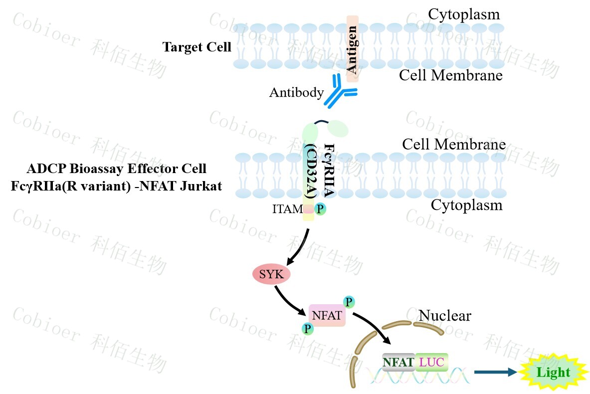 ADCP Bioassay Effector Cell FcγRIIa(R variant) -NFAT Jurkat 報告基因藥靶模型很好的 模擬了體內(nèi) ADCP 的信號轉(zhuǎn)導(dǎo)過程,原理見下圖所示。