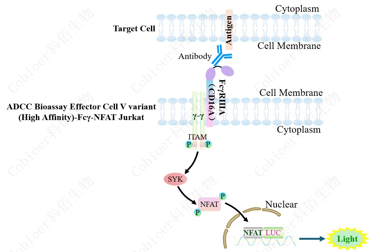 ADCC Bioassay Effector Cell V variant (High Affinity)-Fcγ-NFAT Jurkat 報告基因藥靶模 型很好的模擬了體內 ADCC 的信號轉導過程,原理見下圖所示。