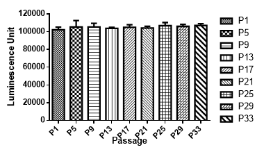 Figure. Stablity test results. LNCAP-Luc cells showed at least 32 passage stability with similar luminescence unit. |