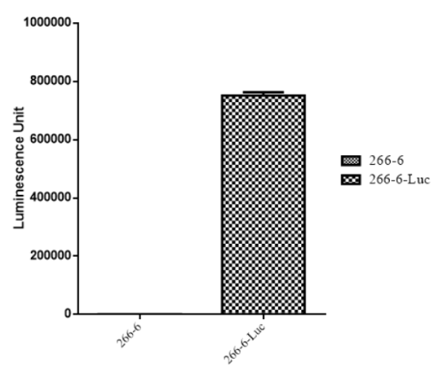 The number of Luminescence signal is 543±18(Mean±SD) on 266-6 cells while 754007±26542(Mean±SD) on 266-6-Luc cells.