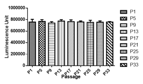 Figure. Stablity test results. 266-6-Luc cells showed at least 32 passage stability with similar luminescence unit.