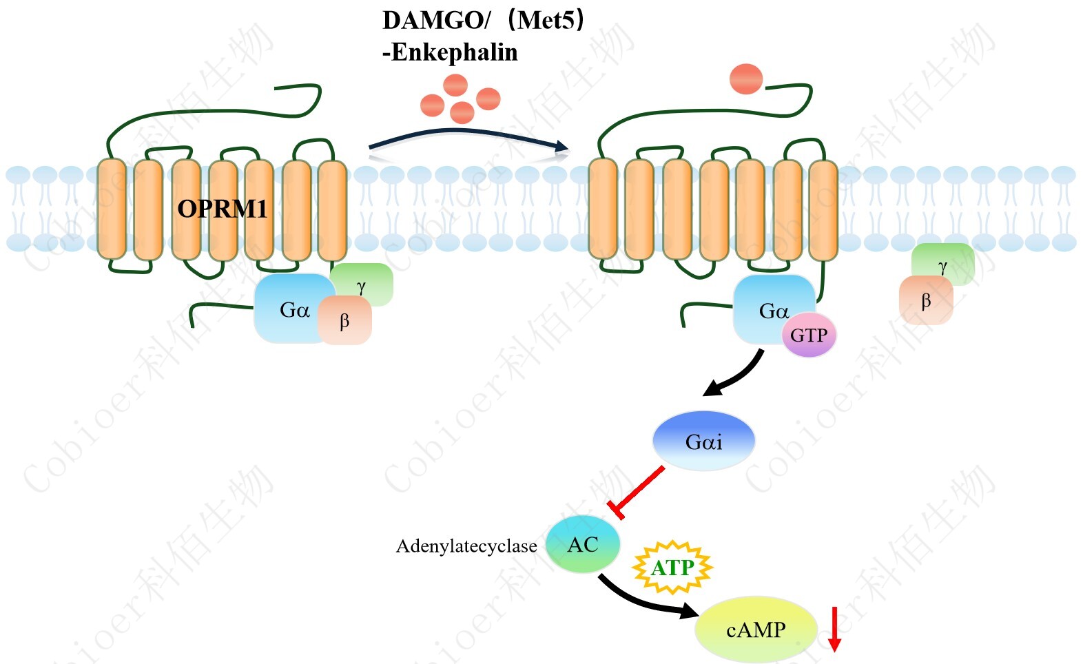 cAMP 在 G 蛋白偶聯(lián)受體(GPCR)信號轉(zhuǎn)導(dǎo)中是一種關(guān)鍵的第二信使。當(dāng)配體結(jié)合到 GPCR,構(gòu)象發(fā)生變化,激活受體接著激活 G 蛋白,Gi 的激活導(dǎo)致腺苷酸環(huán)化酶調(diào)控 cAMP 的下調(diào)。OPRM1 CHO 藥靶模型很好的模擬了體內(nèi) OPRM1 的信號轉(zhuǎn)導(dǎo)過程,原理見 下圖所示。 |