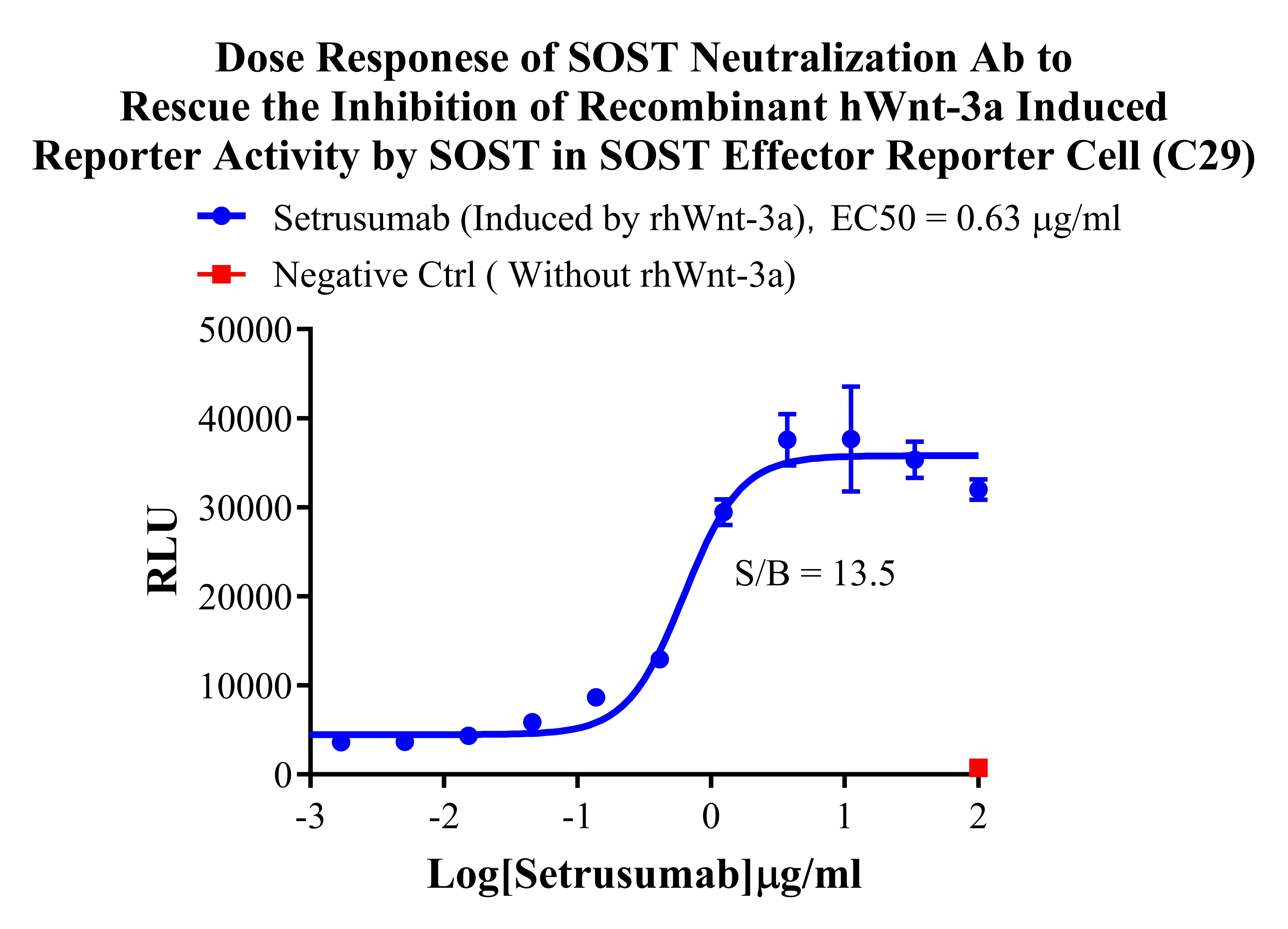 Figure 1. Dose Responese of SOST Neutralization Ab to Rescue the Inhibition of Recombinant hWnt-3a Induced Reporter Activity by SOST in SOST Effector Reporter Cell (C29). |