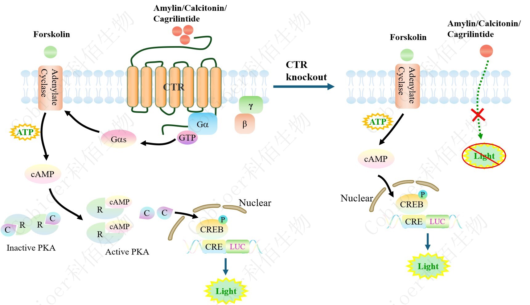 CTR-KO CRE-Luc HEK293 藥靶模型細(xì)胞可以用于 CTR 激動劑的選擇性檢測評價(jià),以 確定候選激動劑是否為 CTR 的特異性激動劑,原理見下圖所示。