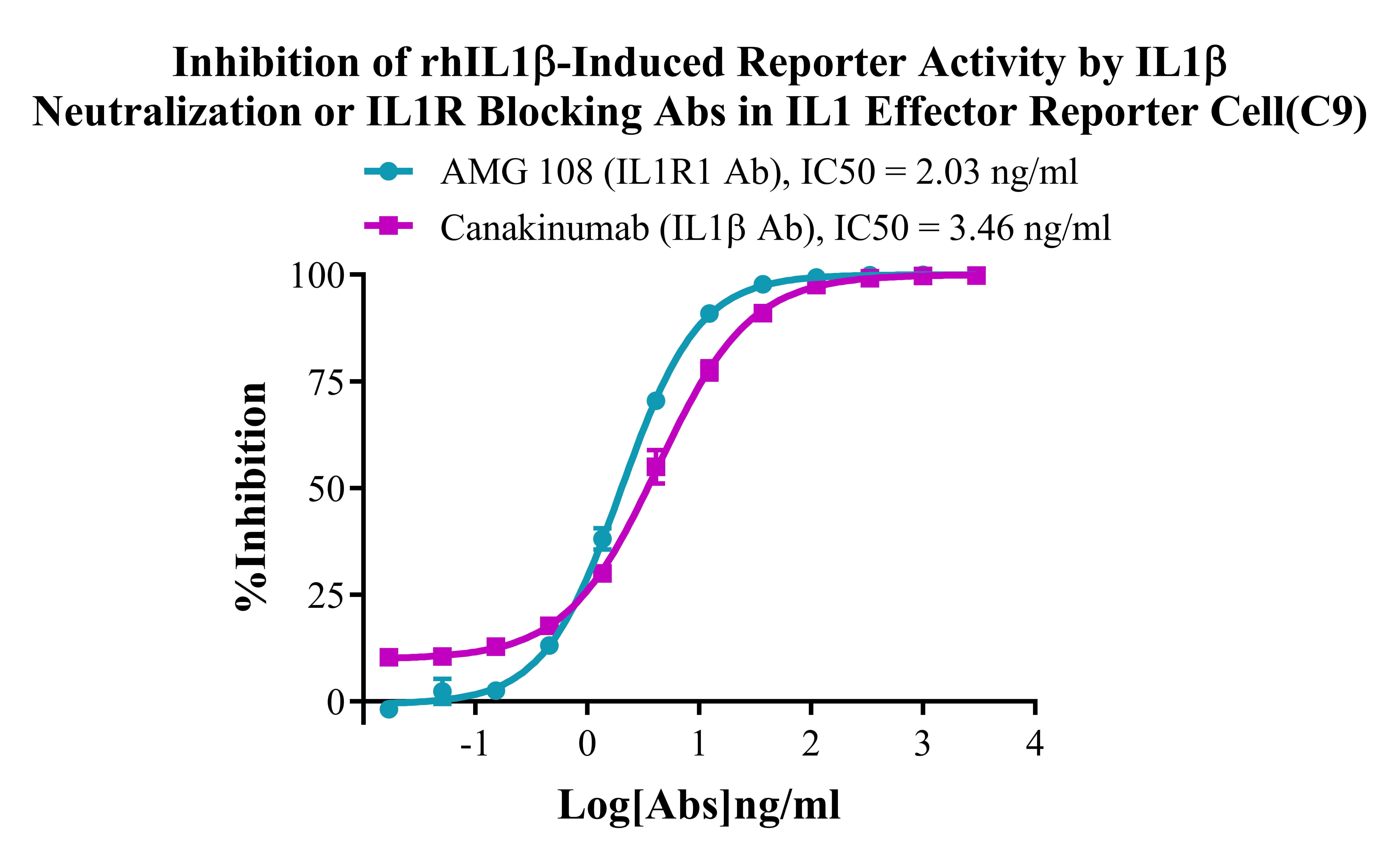 III. Representative Data![]() Figure 2. Dose Response of Recombinant Human IL1β in IL1 Effector Reporter Cell (C9). ![]() Figure 3. Inhibition of rhIL1β-Induced Reporter Activity by IL1β Neutralization or ILlR Blocking Abs in IL1 Effector Reporter Cell(C9). |
