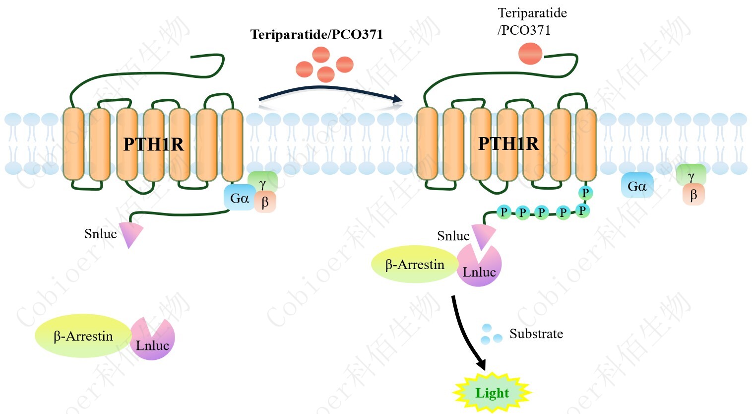PTH1R β-Arrestin CHO PTH1R β-Arrestin CHO 報(bào)告基因藥靶模型很好的模擬了體內(nèi) PTH1R/β-Arrestin 的信號(hào) 轉(zhuǎn)導(dǎo)過(guò)程,原理見下圖所示。當(dāng)缺乏配體刺激時(shí),β-Arrestin 不與 PTH1R 結(jié)合,融合β- Arrestin 的熒光素酶處于失活構(gòu)象,當(dāng) PTH1R 遭遇配體刺激時(shí),融合熒光素酶報(bào)告基因的 β-Arrestin 被招募,使熒光素酶報(bào)告基因處于激活狀態(tài),加入其底物后發(fā)光信號(hào)增強(qiáng)。 ![]() Figure 1. PTH1R β-Arrestin CHO 細(xì)胞模型原理圖 |