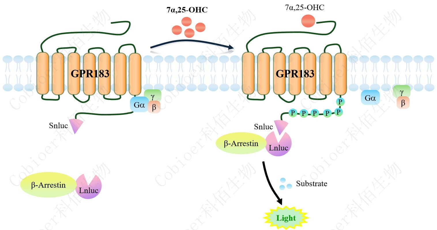GPR183(EBI2) β-Arrestin CHO 報告基因藥靶模型很好的模擬了體內(nèi) GPR183(EBI2)/β- Arrestin 的信號轉(zhuǎn)導(dǎo)過程,原理見下圖所示。當(dāng)缺乏配體刺激時,β-Arrestin不與 GPR183(EBI2) 結(jié)合,融合β-Arrestin 的熒光素酶處于失活構(gòu)象,當(dāng)GPR183(EBI2)遭遇配體 刺激時,融合熒光素酶報告基因的β-Arrestin 被招募,使熒光素酶報告基因處于激活狀態(tài), 加入其底物后發(fā)光信號增強。