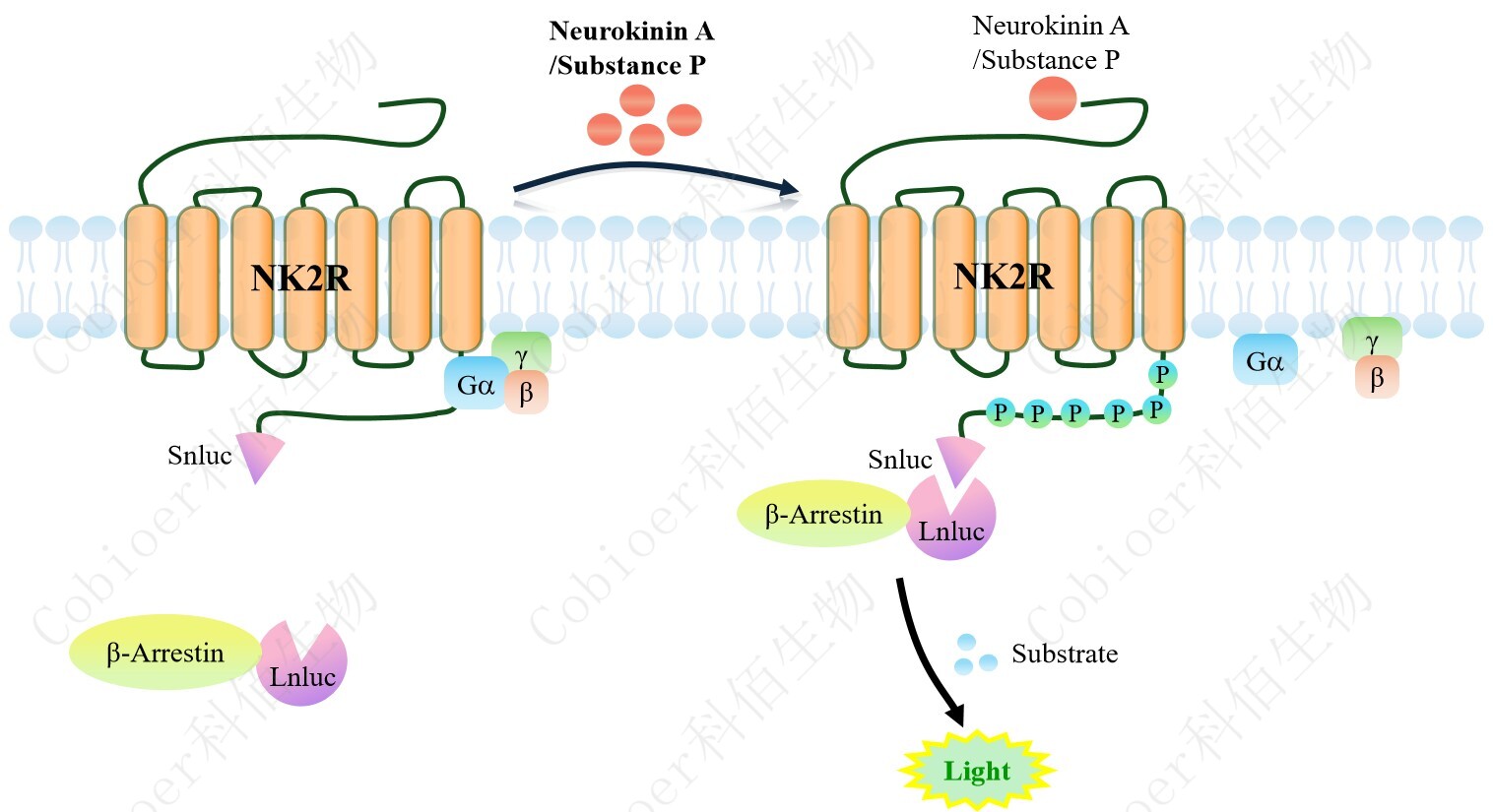 NK2R β-Arrestin CHO 報告基因藥靶模型很好的模擬了體內(nèi) NK2R/β-Arrestin 的信號轉(zhuǎn) 導過程,原理見下圖所示。當缺乏配體刺激時,β-Arrestin 不與 NK2R 結(jié)合,融合β-Arrestin 的熒光素酶處于失活構(gòu)象,當 NK2R 遭遇配體刺激時,融合熒光素酶報告基因的β-Arrestin 被招募,使熒光素酶報告基因處于激活狀態(tài),加入其底物后發(fā)光信號增強。