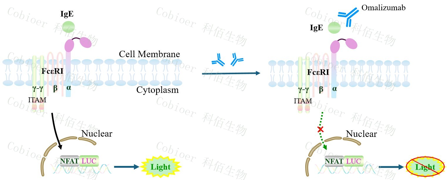 FcεRI Effector Reporter Cell 藥靶模型很好的模擬了 FcεRI的信號轉(zhuǎn)導(dǎo)過程,原理見下圖所示。 Figure 1. FcεRI Effector Reporter Cell細胞模型原理圖 |