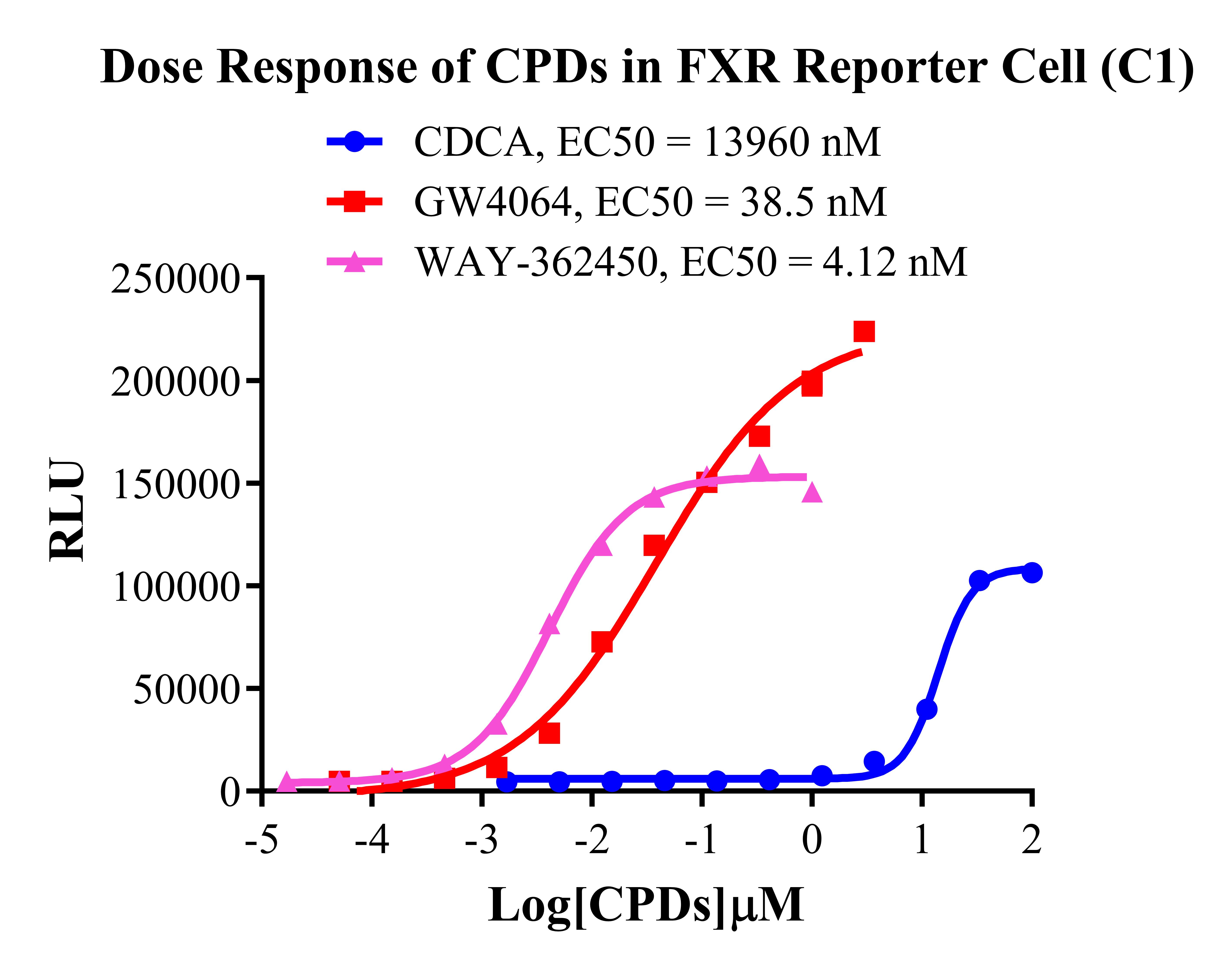 FXR Reporter Cell 報(bào)告基因細(xì)胞,在由調(diào)控因子調(diào)控并表達(dá)報(bào)告基因的 重組細(xì)胞上,穩(wěn)定表達(dá)人 FXR。CDCA,GW4064 和 WAY-362450 是 FXR 的激活劑,原理見下圖所示。