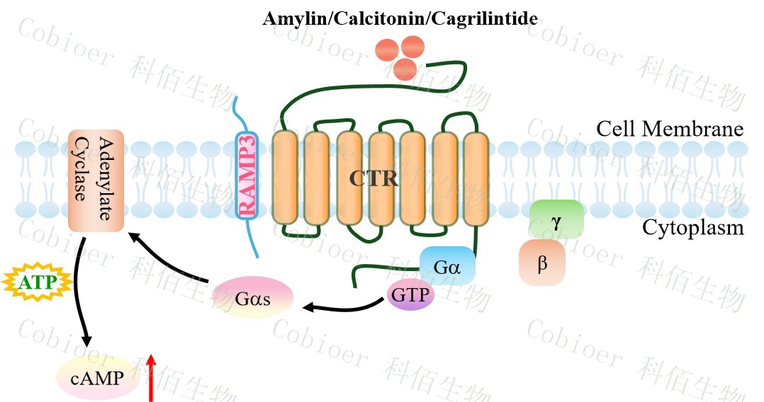 cAMP 在 G 蛋白偶聯(lián)受體(GPCR)信號轉導中是一種關鍵的第二信使。當配體結合 到 GPCR,構象發(fā)生變化,激活受體接著激活 G 蛋白,Gs 的激活導致腺苷酸環(huán)化酶調控 cAMP 的升高。