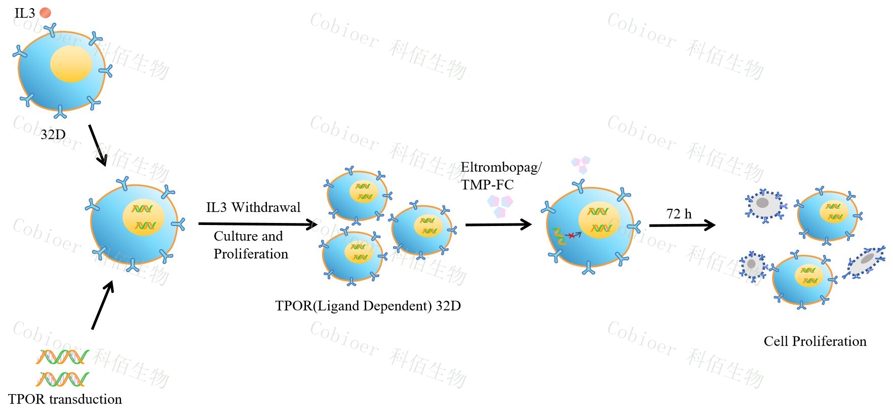 32D(小鼠原 B 細(xì)胞)的生長和增殖需要 IL-3 的維持。通過引入各種表達(dá)激酶的基因, 能作為 32D 的驅(qū)動(dòng)基因,讓 32D 不再依賴 IL-3 而增殖,進(jìn)而激酶基因成為 32D 增殖依賴 的驅(qū)動(dòng)基因,用于評(píng)估小分子藥物對激酶的靶向抑制作用,原理及流程見下圖所示。 Figure 1. TPOR(Ligand Dependent) 32D 細(xì)胞模型原理圖 |