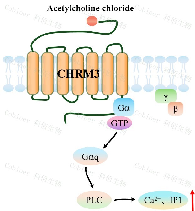 CHRM3(Cholinergic Receptor Muscarinic 3)是毒蕈堿型乙酰膽堿受體(mAChRs)家 族的重要成員,屬于 GPCR,主要分布于外周組織(如 平滑肌、外分泌腺)及部分中樞區(qū) 域(如下丘腦),通過介導(dǎo)乙酰膽堿(ACh)信號調(diào)控平滑肌收縮、腺體分泌及能量代謝。 ACh 結(jié)合 CHRM3 后,激活 Gq/11 蛋白,啟動 PLCβ信號通路,水解 PIP2 生成 IP3 和 DAG, 觸發(fā)細(xì)胞內(nèi)鈣離子釋放,激活蛋白激酶 C(PKC);通過β-arrestin 通路調(diào)控 ERK 磷酸化, 影響細(xì)胞增殖與炎癥反應(yīng)。 | |