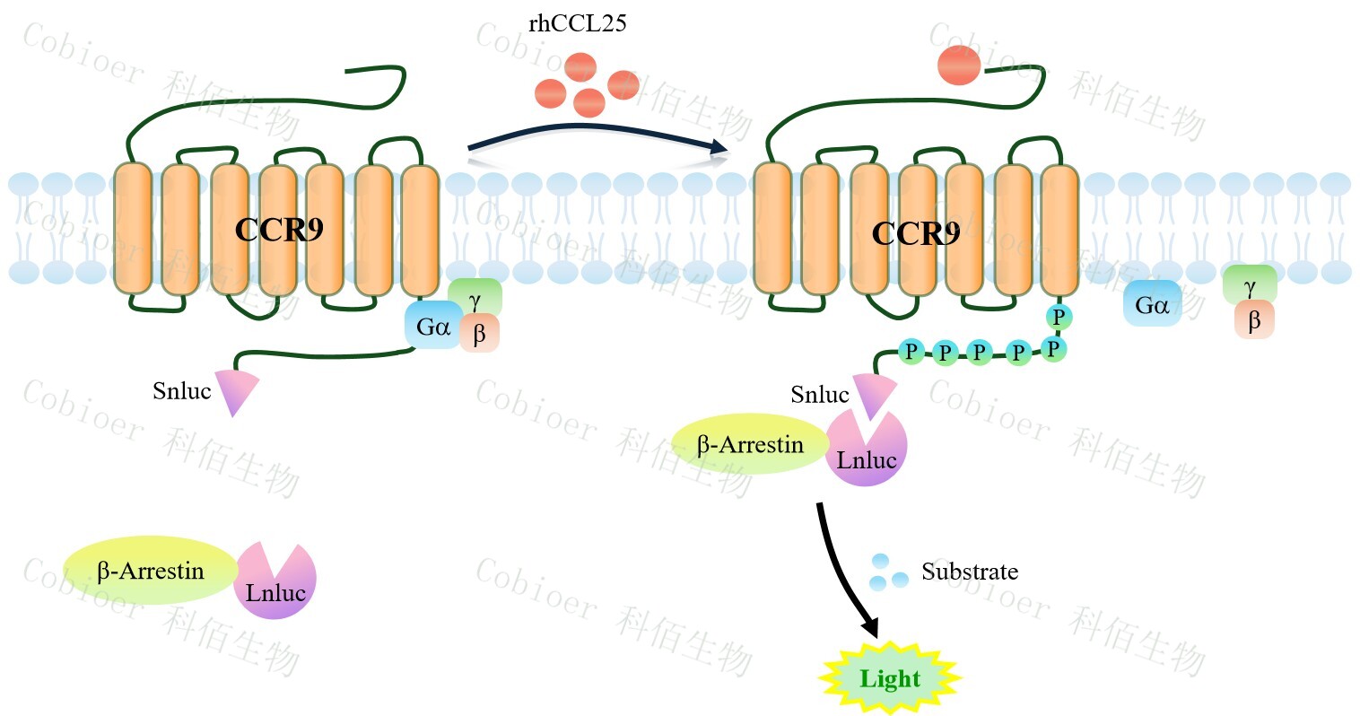 CCR9 β-Arrestin CHO 報(bào)告基因藥靶模型很好的模擬了體內(nèi) CCR9/β-Arrestin 的信號轉(zhuǎn)導(dǎo)過程,原理見下圖所示。當(dāng)缺乏配體刺激時(shí),β-Arrestin 不與 CCR9 結(jié)合,融合β-Arrestin 的熒光素酶處于失活構(gòu)象,當(dāng) CCR9 遭遇配體刺激時(shí),融合熒光素酶報(bào)告基因的β-Arrestin 被招募,使熒光素酶報(bào)告基因處于激活狀態(tài),加入其底物后發(fā)光信號增強(qiáng)。![]() Figure 1. CCR9 β-Arrestin CHO 細(xì)胞模型原理圖 |