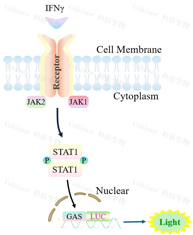 GAS-Luc HEK293 報告基因細胞,是由 GAS 調控并表達 Luc 熒光素酶 報告基因的 HEK293 細胞。IFNγ與受體結合,激活 GAS 的原理見下圖所示。