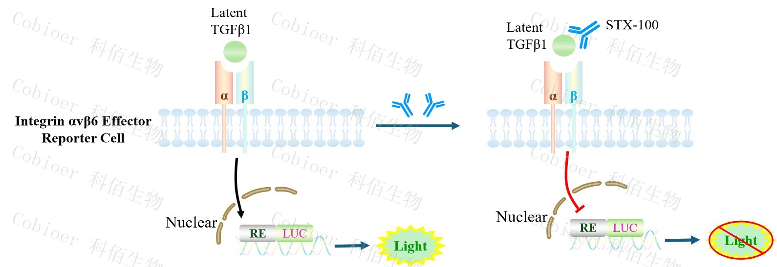 Integrin αvβ6 Effector Reporter Cell 報(bào)告基因藥靶模型很好的模擬了體內(nèi)αvβ6 的信號(hào)轉(zhuǎn) 導(dǎo)過程,原理見下圖所示。