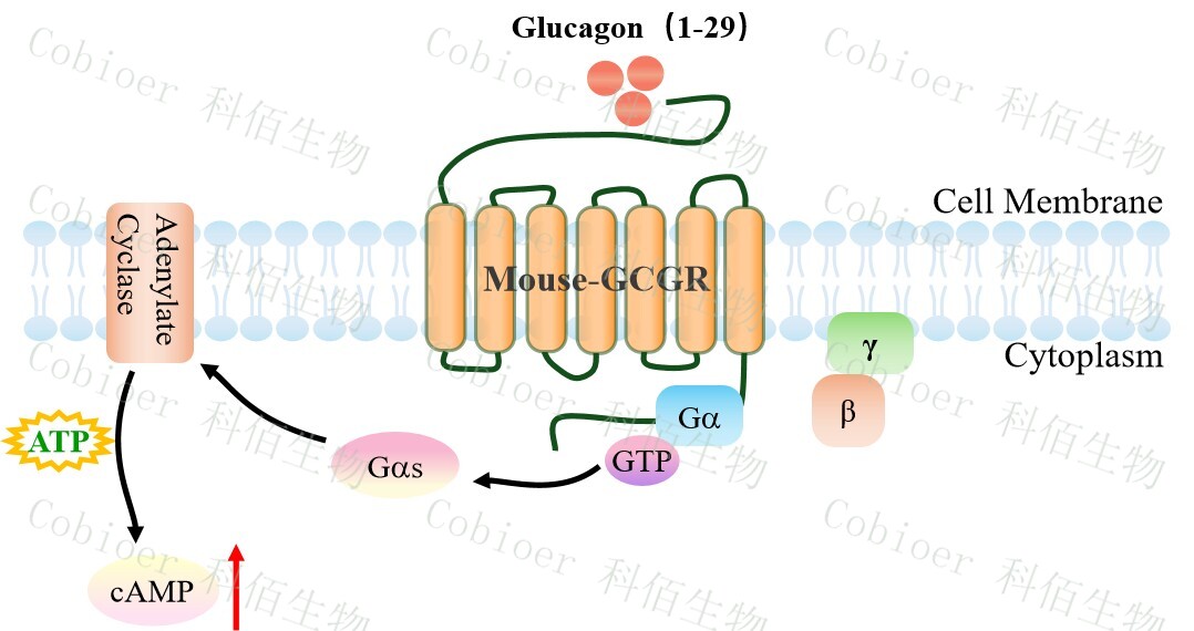 cAMP 在 G 蛋白偶聯(lián)受體(GPCR)信號轉(zhuǎn)導中是一種關鍵的第二信使。當配體結(jié)合到 GPCR,構(gòu)象發(fā)生變化,激活受體接著激活 G 蛋白,Gs 的激活導致腺苷酸環(huán)化酶調(diào)控 cAMP 的升高。Mouse GCGR CHO 藥靶模型很好的模擬了體內(nèi) GCGR 的信號轉(zhuǎn)導過程,原理見下圖所示。![]() Figure 1.Mouse GCGR CHO 細胞模型原理圖
