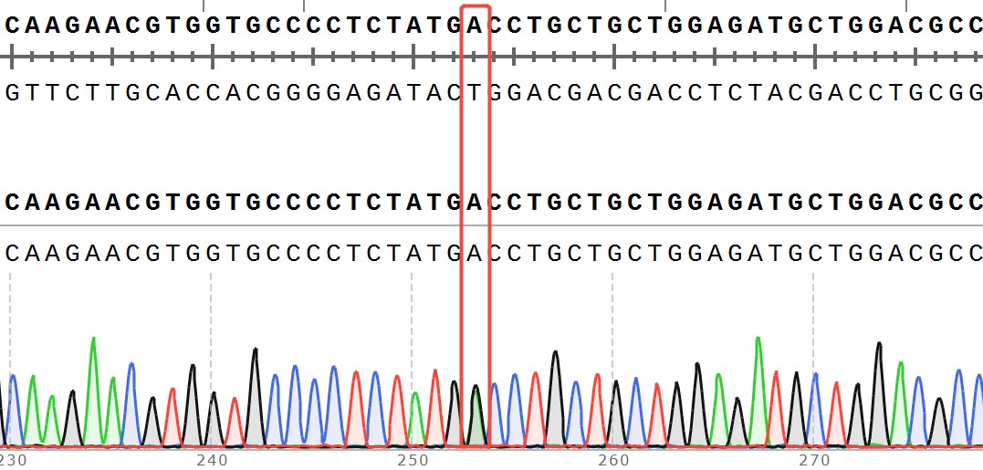 ESR1[D538G](Heterozygous,AF%66.7) Isogenic MCF7 藥靶細胞,通過基 因編輯的方式將 ESR1 的 538 位氨基酸天冬氨酸(D)突變?yōu)楦拾彼幔℅)。![]() Figure 1. ESR1[D538G](Heterozygous,AF%66.7) Isogenic MCF7 原理示意圖 |