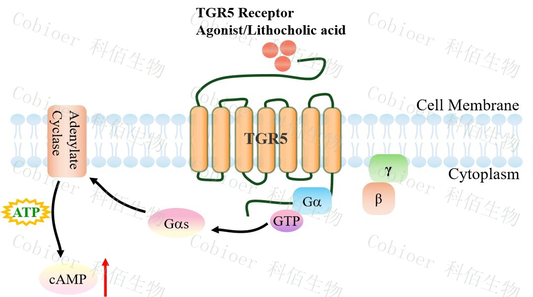 TGR5 受體是第一個(gè)已知的膽汁酸特異性 G 蛋白偶聯(lián)受體,也被稱為膽汁酸受體 1(GPBAR1),屬于 A 類 GPCR 亞家族。該受體由七個(gè)跨膜螺旋(TMH1-7)、三個(gè)胞外環(huán) (ECL1-3)組成,有助于配體結(jié)合,以及三個(gè)胞內(nèi)環(huán)(ICL1-3),參與將信號(hào)傳遞給下游 信號(hào)分子。TGR5 在體內(nèi)廣泛存在,在膽囊、回腸、結(jié)腸、棕色脂肪組織、脾臟、肺、骨 骼肌、胰島,肝臟中均有表達(dá)。有文獻(xiàn)報(bào)道 TGR5 被認(rèn)為是治療代謝性疾?。ㄈ?2 型糖尿 ?。┑臐撛诎悬c(diǎn)。此外,TGR5 還能降低單核細(xì)胞中促炎細(xì)胞因子的水平,在炎癥過(guò)程 (包括結(jié)腸炎和動(dòng)脈粥樣硬化)中發(fā)揮核心作用的病理調(diào)節(jié)。 | |