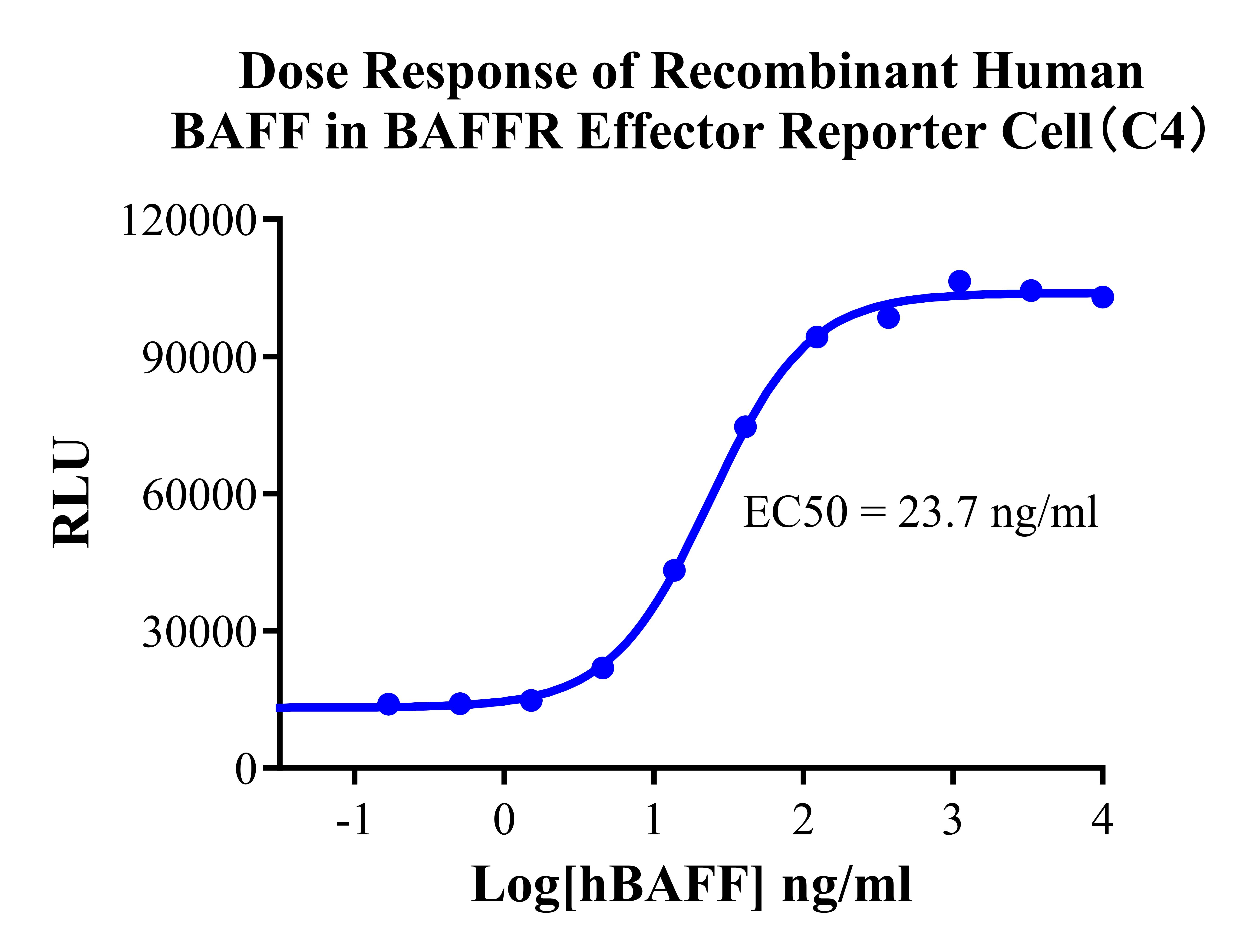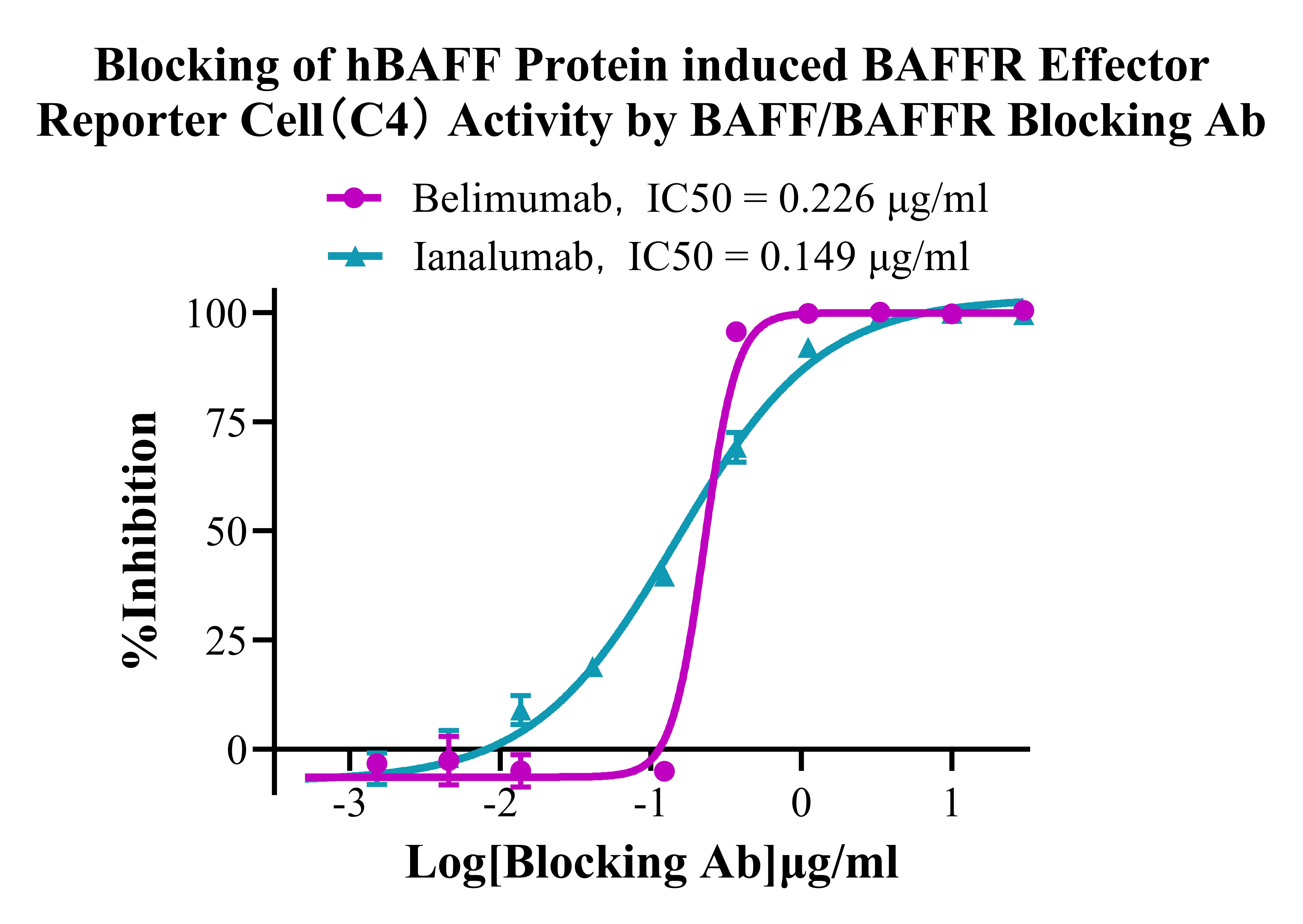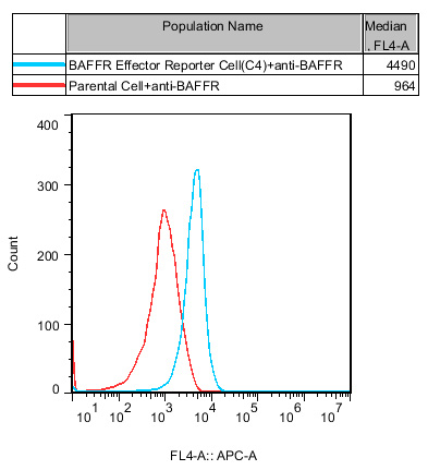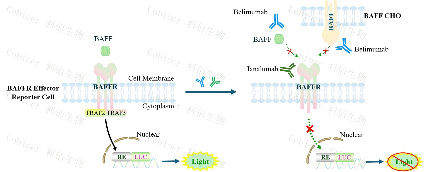 BAFFR Effector Reporter Cell 報(bào)告基因藥靶模型很好的模擬了體內(nèi) BAFF 的信號(hào)轉(zhuǎn)導(dǎo)過(guò)程,原理見(jiàn)下圖所示。![]() Figure 1. BAFFR Effector Reporter Cell 細(xì)胞模型原理圖 |