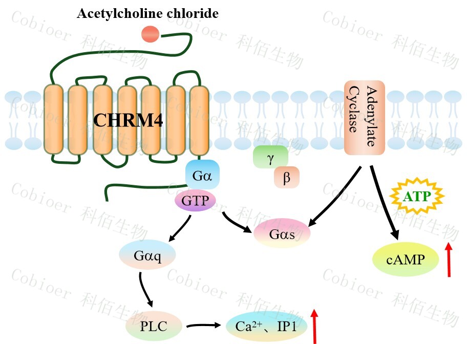 毒蕈堿乙酰膽堿受體(MAChRs,簡稱 M 受體)參與中樞神經(jīng)系統(tǒng)的運動控制、體溫 調(diào)節(jié)、心血管調(diào)節(jié)和記憶,介導(dǎo)周圍神經(jīng)系統(tǒng)的平滑肌收縮、腺體分泌和心率、調(diào)節(jié)心肌 收縮力。CHRM4 作為 Gi/o 偶聯(lián)型毒蕈堿受體,中樞神經(jīng)系統(tǒng)高表達,其內(nèi)源性配體乙酰 膽堿(ACh)激活后優(yōu)先通過 Gi/oα亞基抑制腺苷酸環(huán)化酶,同時釋放 Gβγ二聚體。