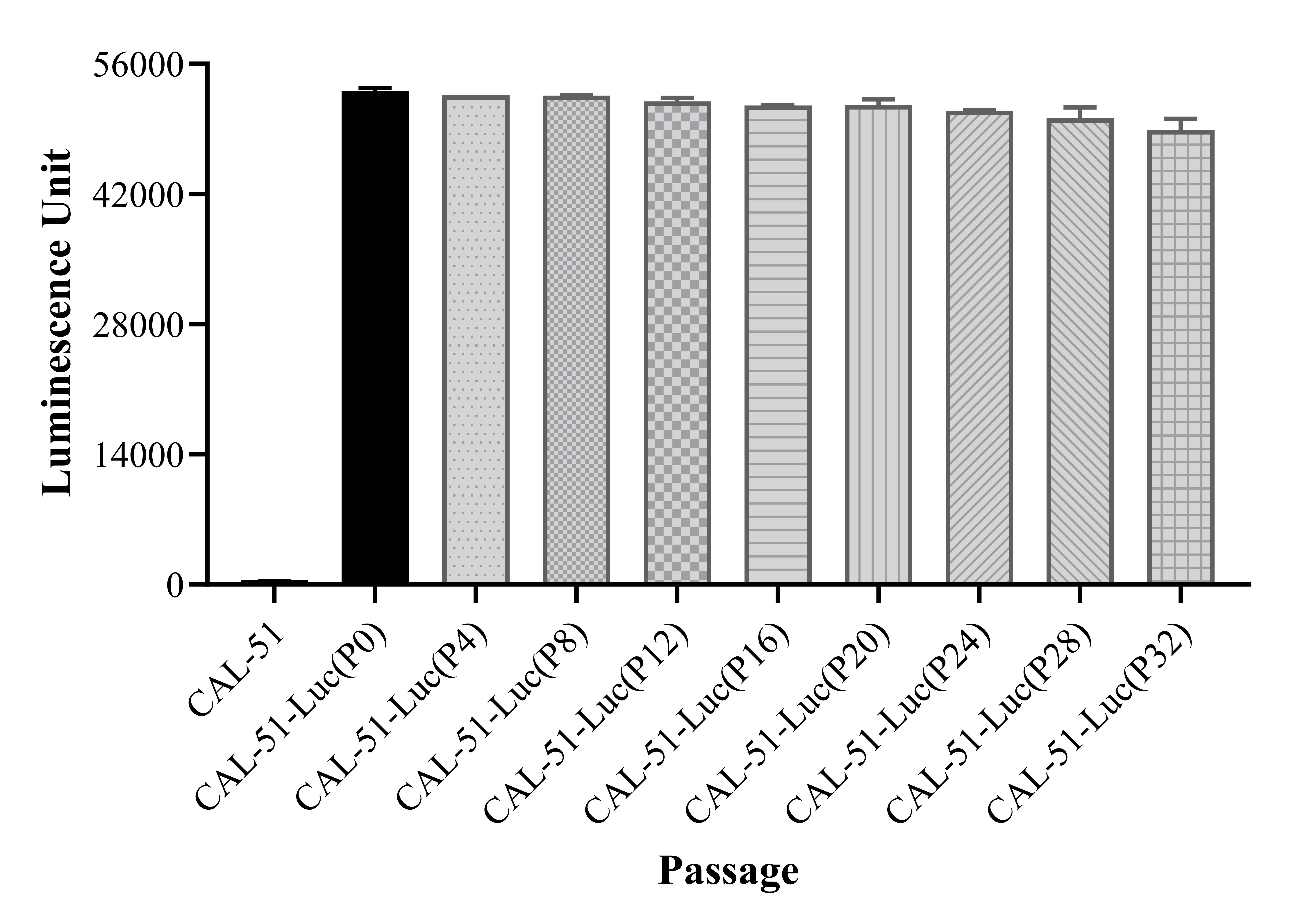 Figure 1. Stablity test results. CAL-51-Luc showed at least 32 passage stability with similar luminescence unit. |
