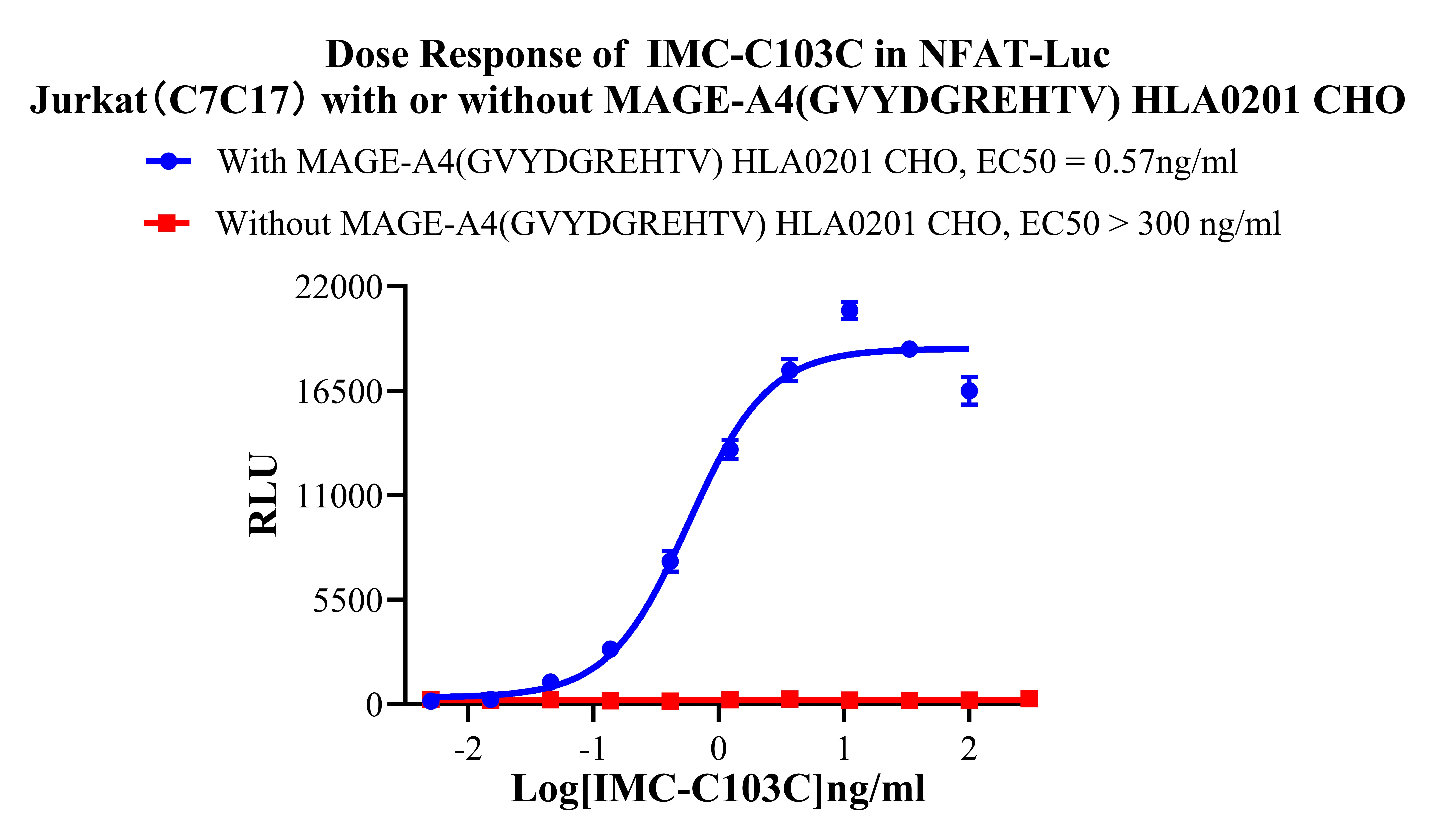 Figure 1. Dose Response of IMC-C103C in NFAT-Luc Jurkat(C7C17) with or without MAGE-A4(GVYDGREHTV) HLA0201 CHO.