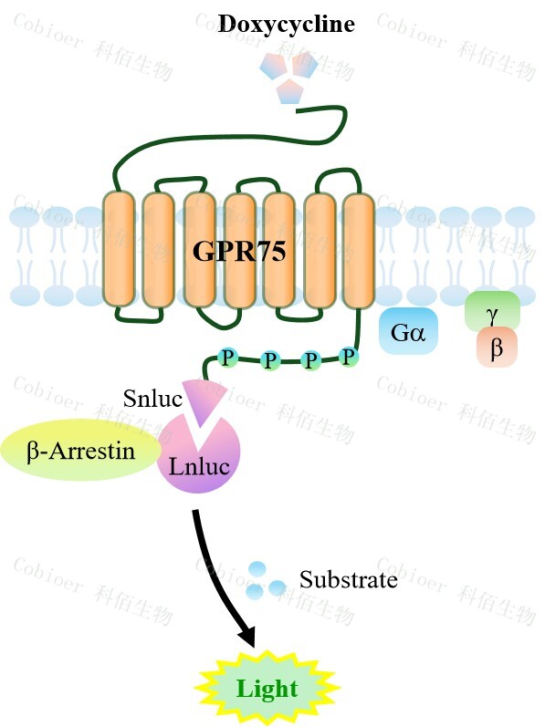 Inducible GPR75 β-Arrestin CHO 報(bào)告基因藥靶模型很好的模擬了體內(nèi) GPR75/β-Arrestin 的信號(hào)轉(zhuǎn)導(dǎo)過(guò)程,原理見(jiàn)下圖所示。