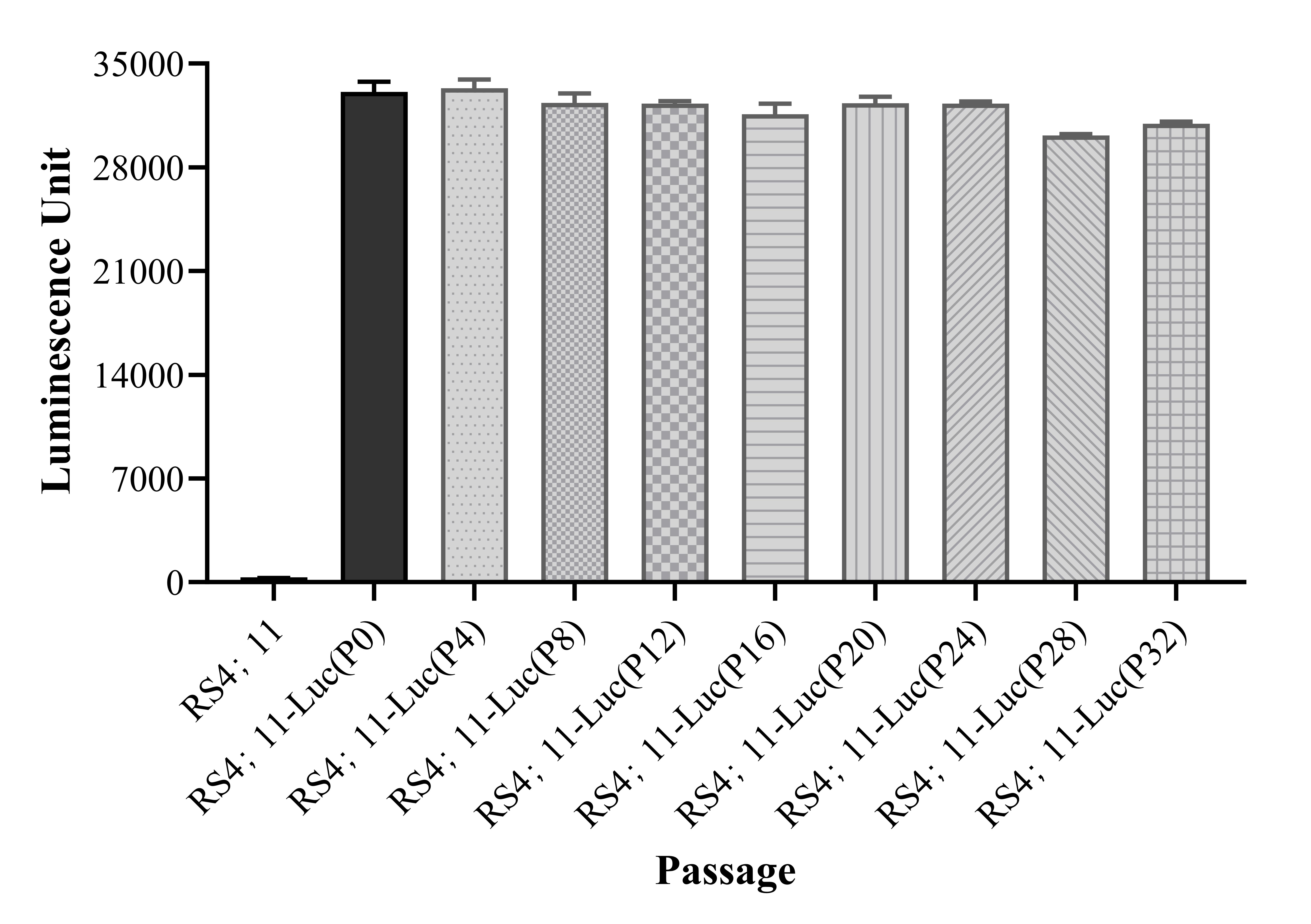 Figure 1. Stablity test results. RS4;11-Luc showed at least 32 passage stability with similar luminescence unit. |
