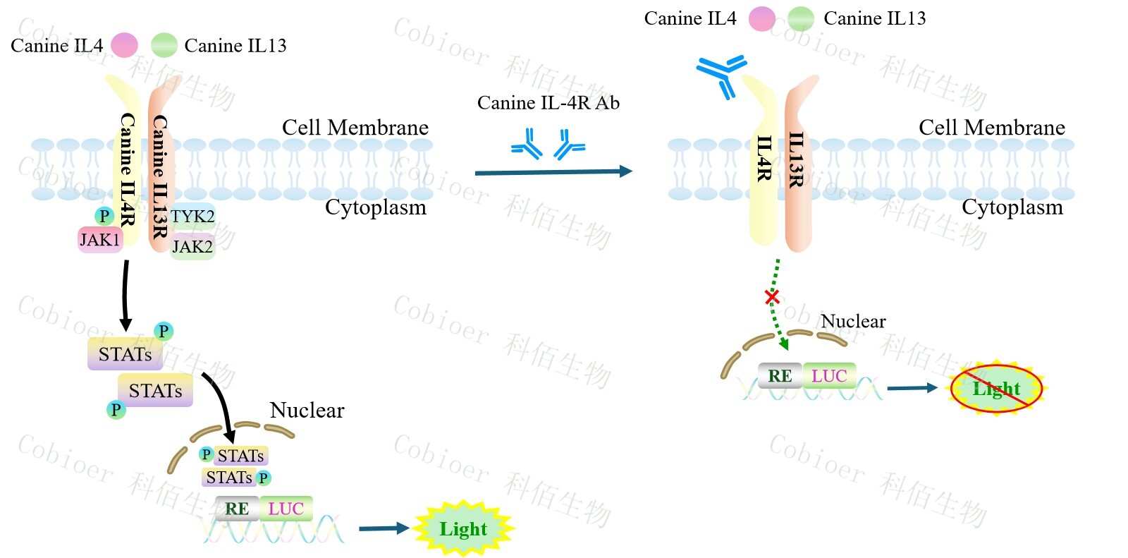 Canine IL4/IL13 Dual Effector Reporter Cell 報(bào)告基因藥靶模型很好的模擬了體內(nèi) IL4/IL13 的信號(hào)轉(zhuǎn)導(dǎo)過程,原理見下圖所示。
