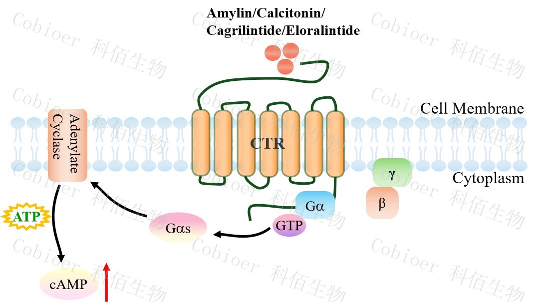 胰淀素(Amylin)受體的三種類型的已被確定,即 AMY1,AMY2 和 AMY3。胰淀素 受體屬于 B 類 GPCR,是異二聚體復(fù)合物,由降鈣素受體(CTR)與受體活性修飾蛋白 (RAMPs)結(jié)合形成。該受體的 CTR 組分具有相同的 GPCR 結(jié)構(gòu):7 個(gè)跨膜相互連接的α- 螺旋,將細(xì)胞外信號(hào)傳遞到細(xì)胞內(nèi)細(xì)胞質(zhì)信號(hào)級(jí)聯(lián)。RAMP 有三種類型(RAMP1、 RAMP2 和 RAMP3),它們共享 31%的氨基酸序列,具有相似的基本結(jié)構(gòu)。RAMP 是將 CTR 轉(zhuǎn)運(yùn)到細(xì)胞膜并調(diào)節(jié)其配體特異性的重要肽,它可以改變特定 GPCR 的藥理學(xué)、功能 和細(xì)胞運(yùn)輸。
