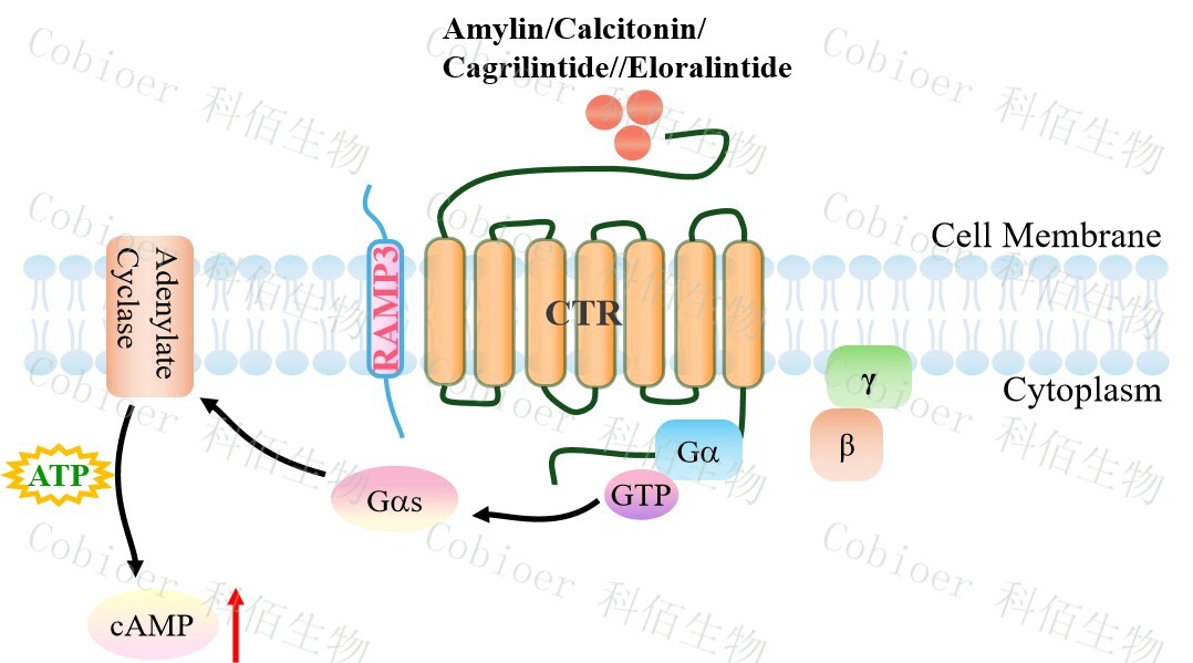 胰淀素(Amylin)受體的三種類(lèi)型的已被確定,即 AMY1,AMY2 和 AMY3。胰淀素 受體屬于 B 類(lèi) GPCR,是異二聚體復(fù)合物,由降鈣素受體(CTR)與受體活性修飾蛋白 (RAMPs)結(jié)合形成。該受體的 CTR 組分具有相同的 GPCR 結(jié)構(gòu):7 個(gè)跨膜相互連接的α- 螺旋,將細(xì)胞外信號(hào)傳遞到細(xì)胞內(nèi)細(xì)胞質(zhì)信號(hào)級(jí)聯(lián)。RAMP 有三種類(lèi)型(RAMP1、 RAMP2 和 RAMP3),它們共享 31%的氨基酸序列,具有相似的基本結(jié)構(gòu)。RAMP 是將 CTR 轉(zhuǎn)運(yùn)到細(xì)胞膜并調(diào)節(jié)其配體特異性的重要肽,它可以改變特定 GPCR 的藥理學(xué)、功能 和細(xì)胞運(yùn)輸。