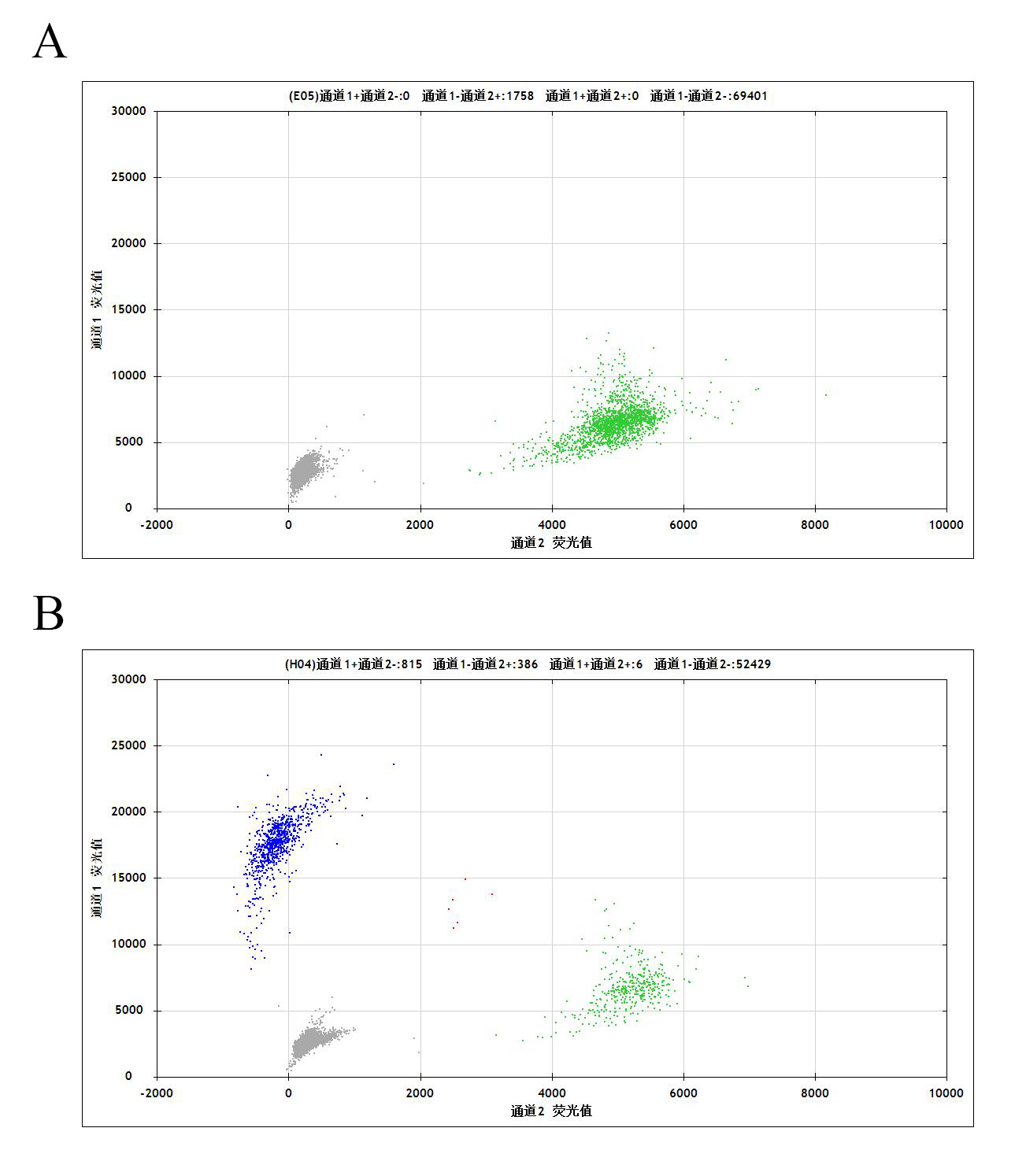 Figure 3. A: MCF7 Parental Cell;B:ESR1[Y537N](Heterozygous,AF%:66.7) Isogenic MCF7 通道2 藍(lán)色微滴代表ESR1[Y537N]突變陽性,通道2 綠色微滴代表該位點(diǎn)為陰性野生型