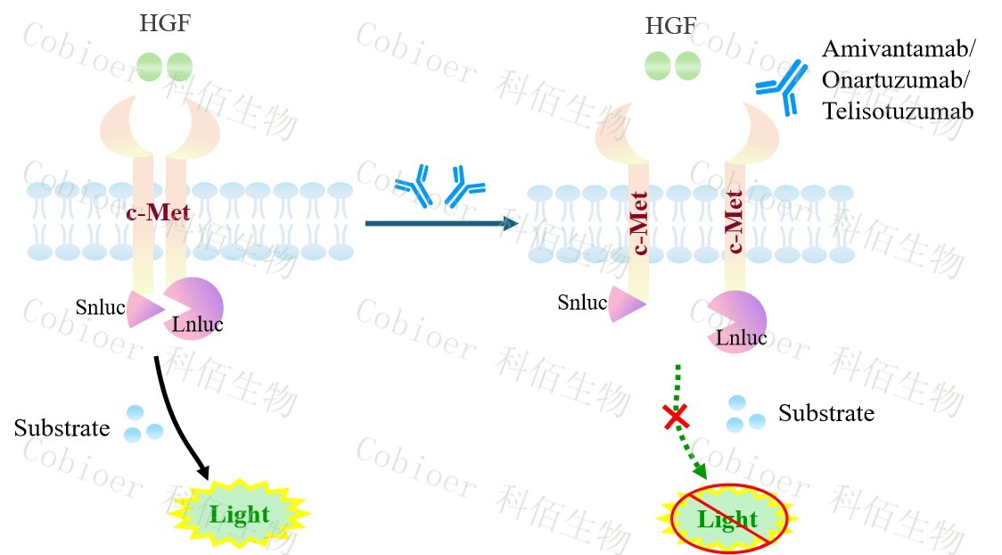 MET Dimerization CHO 報告基因藥靶模型很好的模擬了體內(nèi) MET 的信號轉(zhuǎn)導(dǎo)過程, 原理見下圖所示。